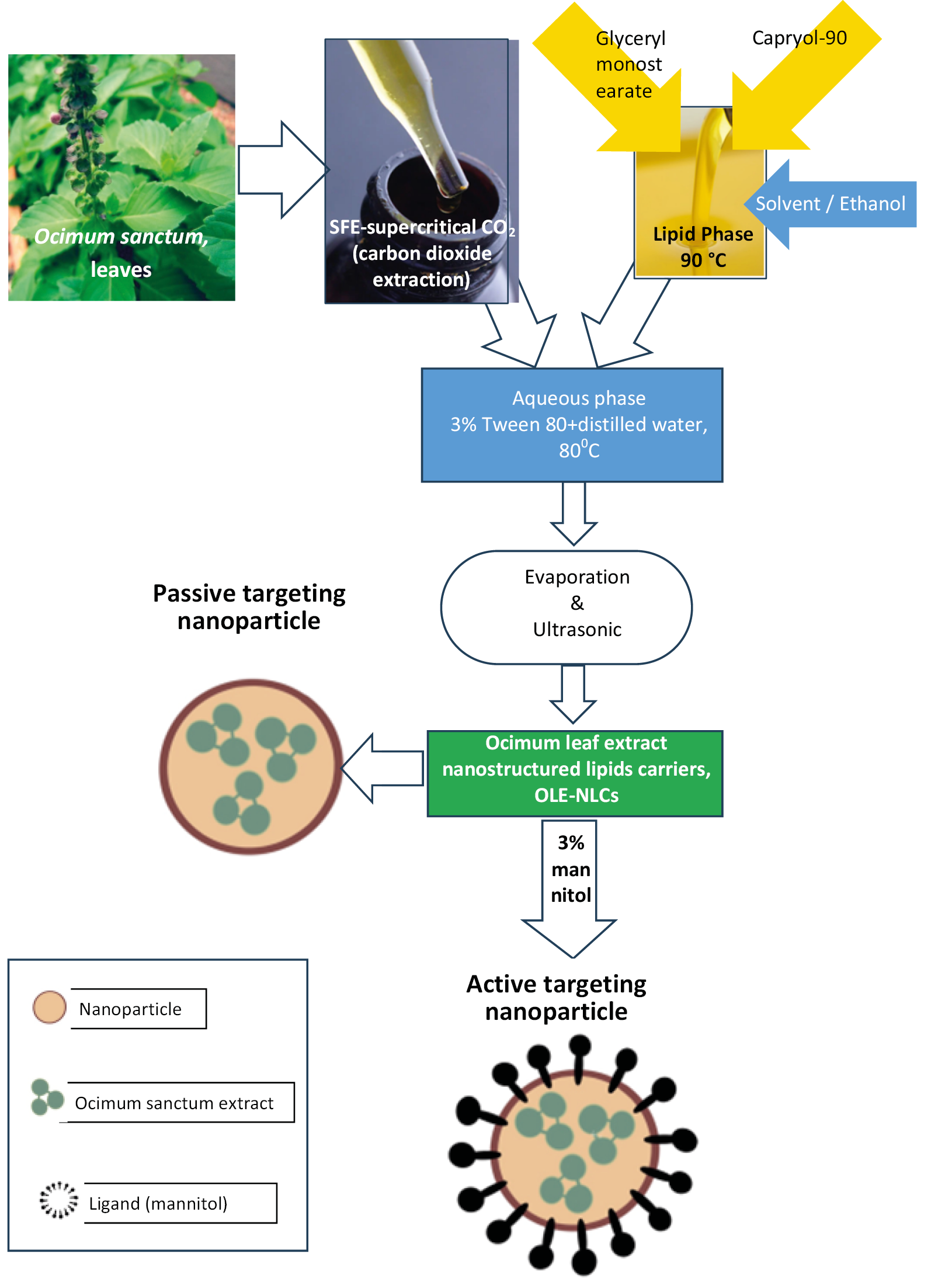 The Ocimum sanctum leaf extract was prepared by the extraction method with supercritical CO2. Various surfactants (Tween 80), solid lipids (glyceryl monostearate) and liquid lipids (Capryol-90) have been used to prepare nanostructures loaded with Ocimum sanctum (Figure 3; visual representation of the technological flow).35, 36 The resulting nanoparticles facilitate the transport of Ocimum sanctum through tissues via passive or active targeting. Passive targeting involves diffusion into transdermal tissue, while active targeting involves conjugation of ligands (mannitol) to nanoparticles for greater specificity and absorption at the site of inflammation. The results demonstrated the efficiency of treatment with lipid nanostructures compared to the standard formulation with diclofenac topical gel, in antiarthritic applications.