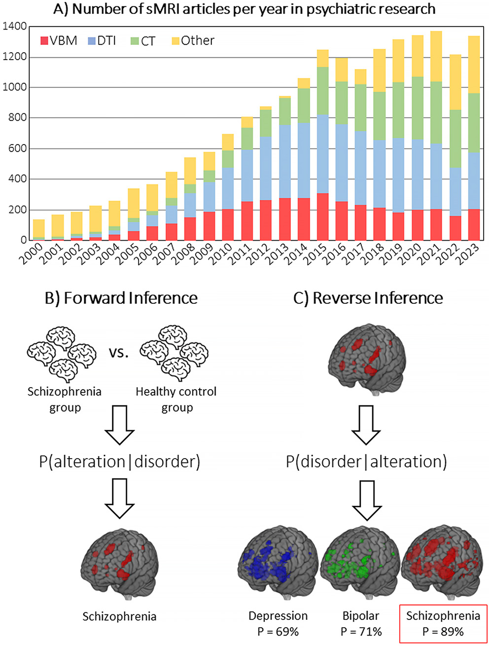 In the context of clinical research, the term “diagnostic biomarker” denotes a diverse spectrum of medically relevant signals or objective indices of clinical status with the potential to detect and/or confirm the presence of a condition of interest.1 The advent of structural magnetic resonance imaging (sMRI) nearly 3 decades ago generated fervent enthusiasm about its potential to revolutionize our comprehension of the neuroanatomical basis of psychiatric disorders and to identify clinically valuable brain-based markers. Although the development of several sMRI-based techniques and the associated exponential proliferation of studies have facilitated substantial progress in elucidating the former goal (graphical overview in Figure 1), it is crucial to emphasize that no discernible metrics or models stemming from these advanced techniques have been integrated into daily clinical diagnostic practice thus far.2, 3, 4, 5, 6, 7, 8, 9, 10, 11 As a result, contemporary psychiatric diagnoses rely on descriptive data collected through clinical observation,12 leaving the development of neuroimaging biomarkers for predicting diagnostic categories or disease progression an open challenge.