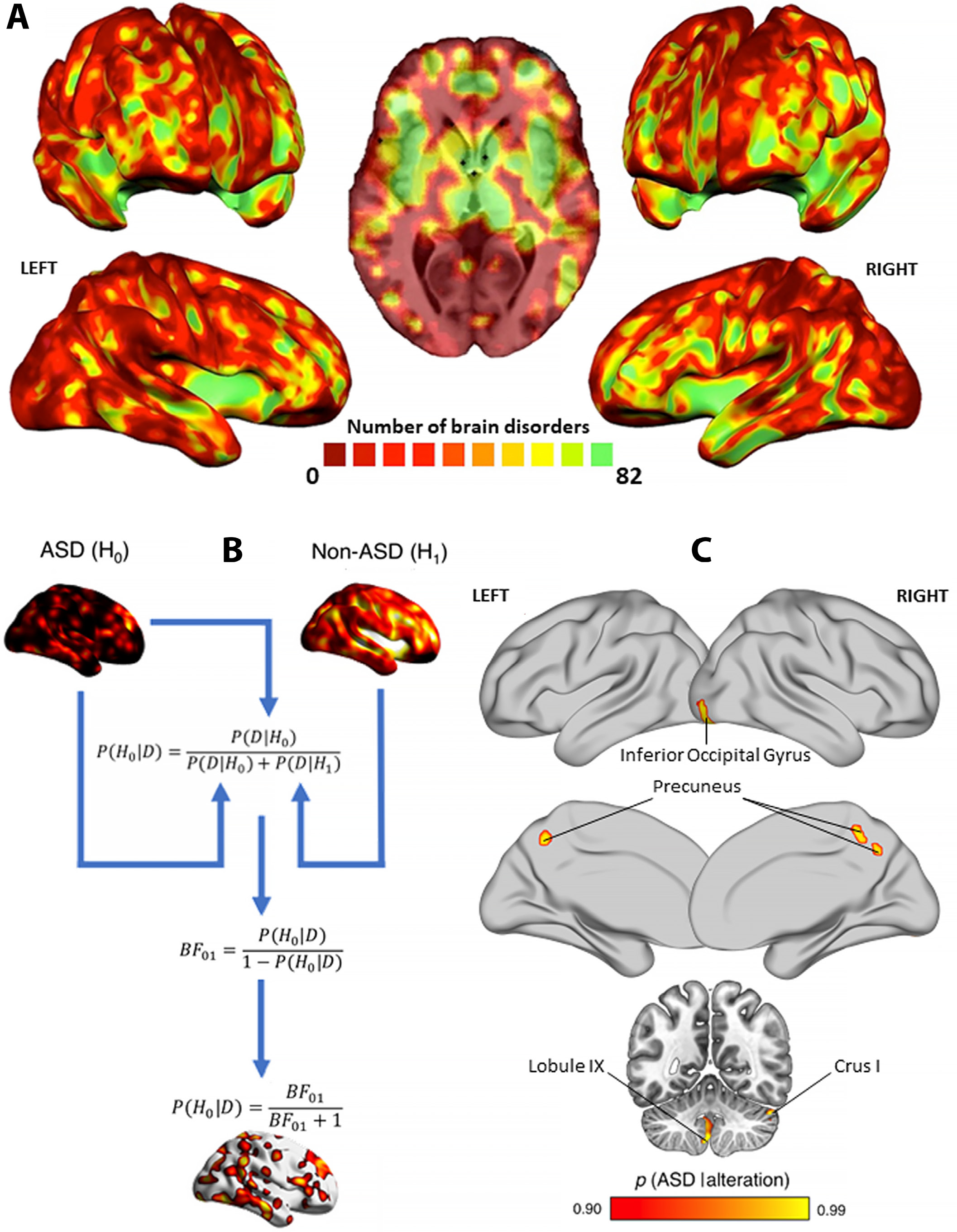 Recently, BACON was used to explore the presence of selective brain abnormalities in autism spectrum disorder across an extensive dataset of 849 VBM experiments, accounting for over 22,000 clinical study participants diagnosed with 132 different brain disorders.51 Intriguingly, findings highlighted the existence of significant abnormalities in both cortical and cerebellar regions, with a selectivity value ≥90% (i.e., p0.9) (Figure 2). Significantly, this study not only introduced a new perspective on understanding the autistic brain, but also presented a reverse inference framework with wide-reaching potential. In fact, the BACON approach is applicable to any other clinical condition that exhibits regional variations in brain structure, as detected through VBM, CT, DWI, DTI, or other group-level sMRI techniques with case-control designs. Furthermore, this toolbox is also potentially applicable to the study of disorder-selective functional brain aberrations as revealed using several whole-brain voxel-wise nuclear medicine and fMRI techniques, such as positron emission tomography (PET), arterial spin labeling (ASL), regional homogeneity (ReHo), or amplitude of low-frequency fluctuations (ALFF), broadening its utility in the field of clinical neuroimaging. Nonetheless, it is crucial to note the current lack of studies in this specific area of research, which underscores the necessity for future multimodal imaging endeavors.