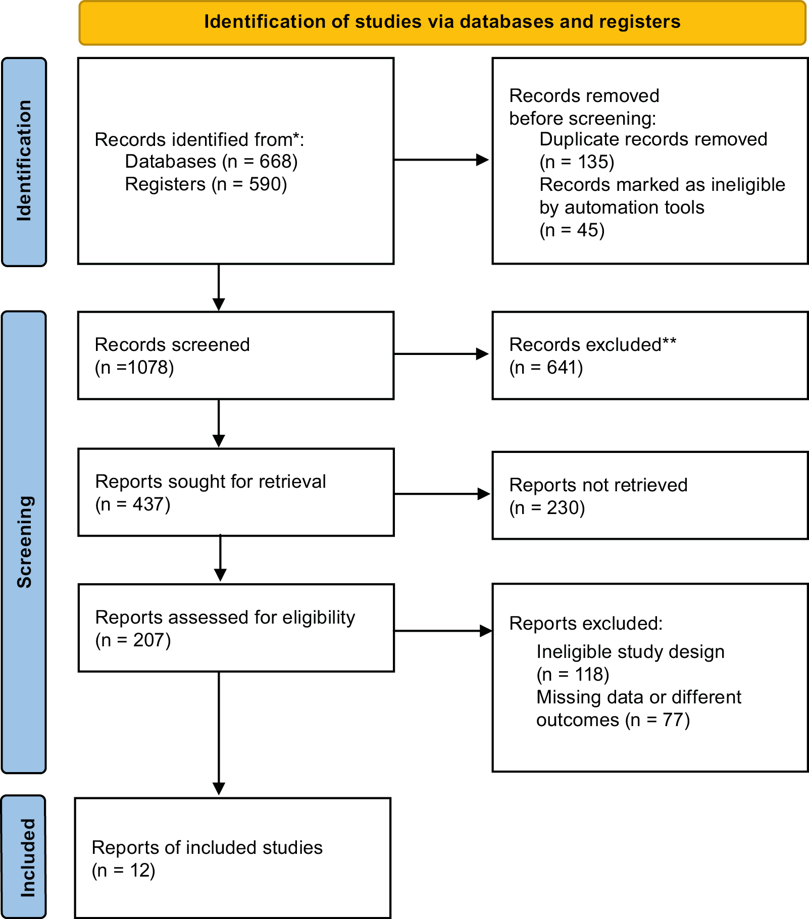 A total of 1258 potential publications were retrieved through a database search. After full-text assessment, 12 studies met the inclusion criteria and were evaluated in this meta-analysis.14, 15, 16, 17, 18, 19, 20, 21, 22, 23, 24, 25 The process of literature search and screening is depicted in Figure 1. The selected studies involved a total of 4102 patients. All included studies were randomized controlled trials (RCTs). The sample size of the integrated studies ranged from 36 to 716 osteosarcoma patients at the beginning of the trial. The main features of the selected studies are summarized in Table 2.