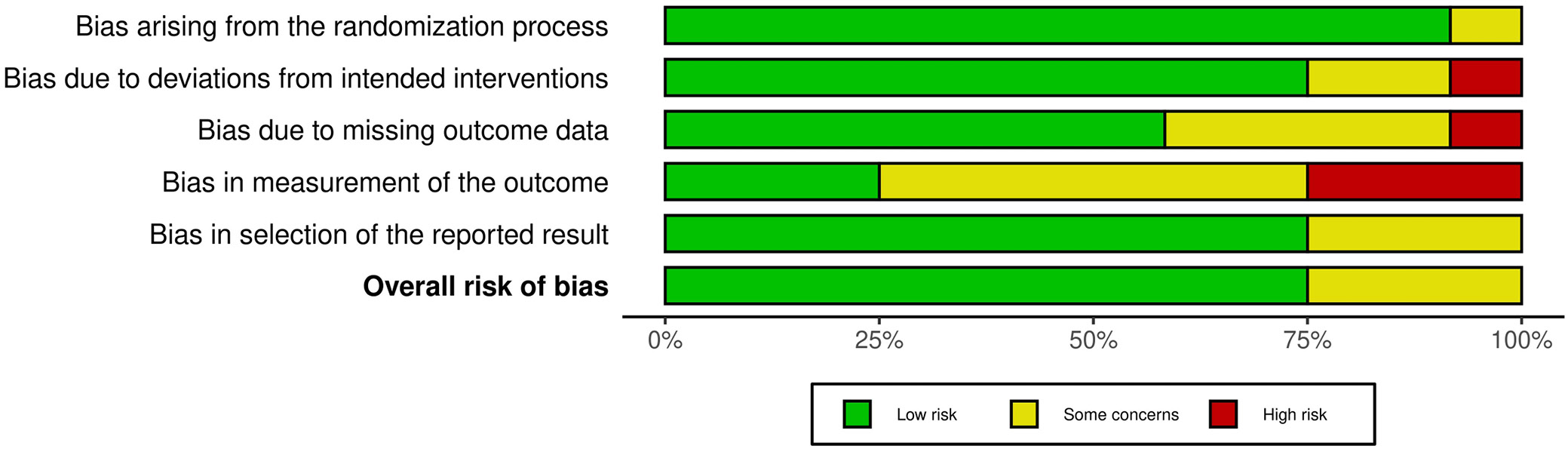 The risk of bias in the eligible studies was evaluated according to the Cochrane Collaboration tool (Risk of Bias 2 (RoB2)). All included trials adequately described the randomization procedures, while blinding and allocation concealment were variable. The evaluation of the risk of bias is summarized in Figure 2.