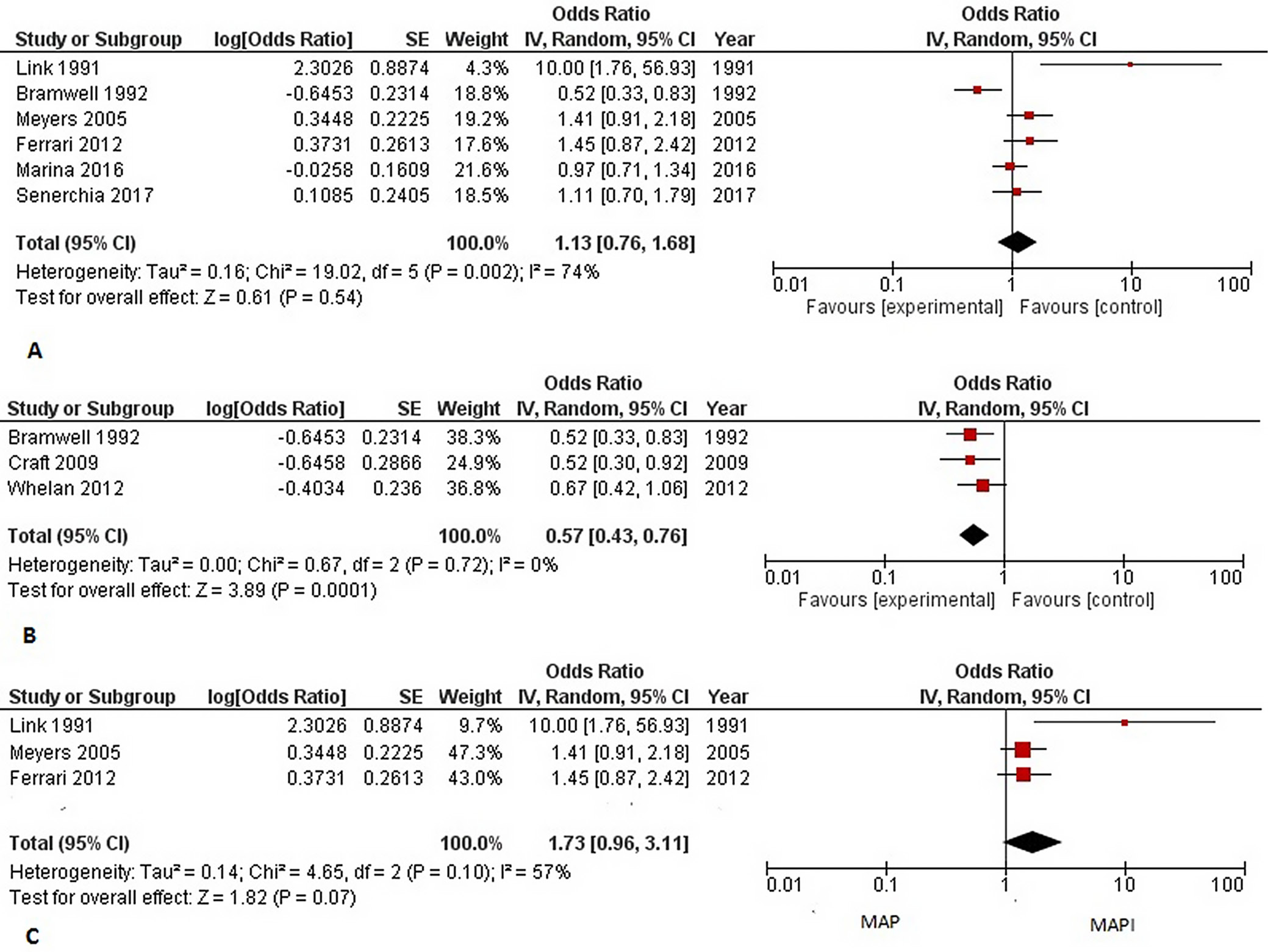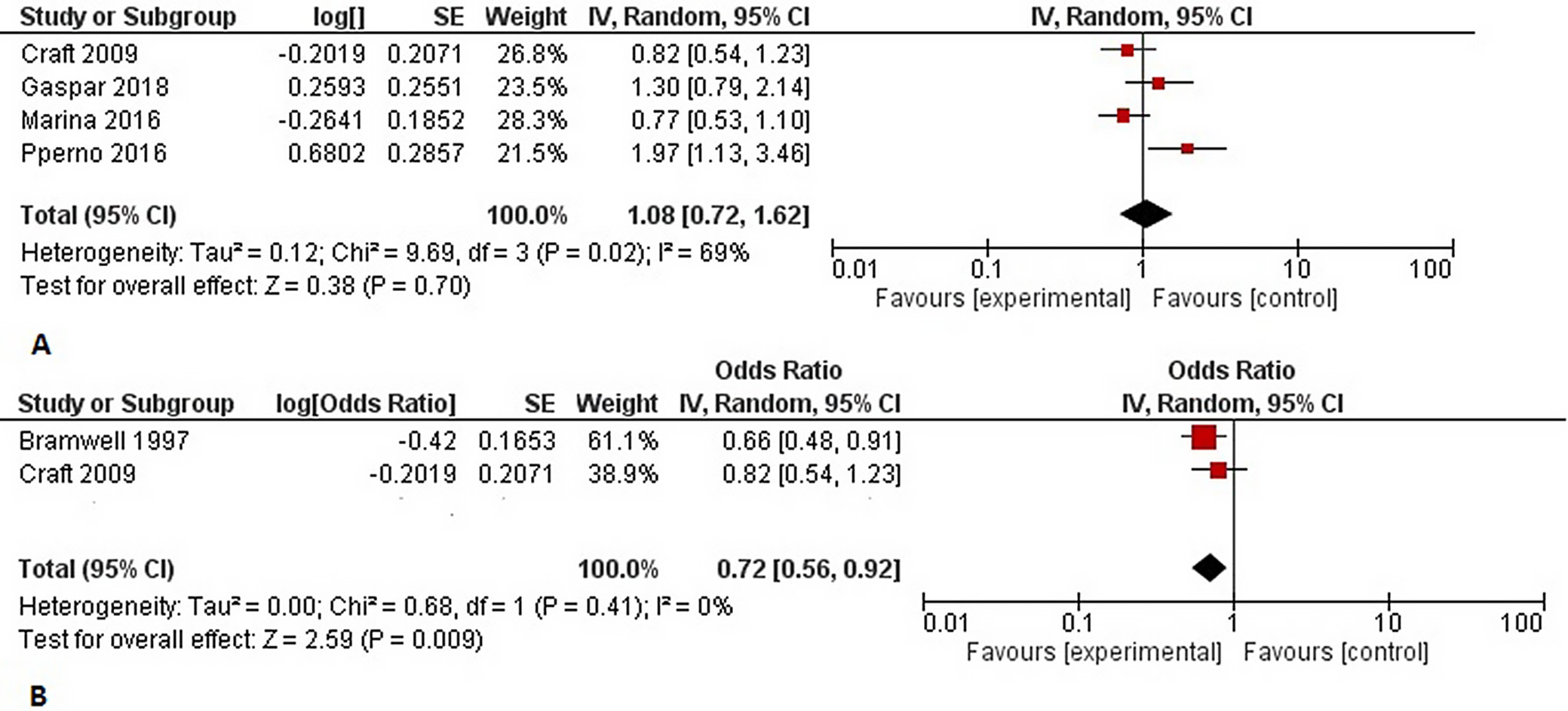 Four studies (n = 1886) reported data related to the 3-year OS rates. The comparison of MAP with different therapeutic regimens, including doxorubicin and cisplatin regimens or MAP chemotherapy regimens plus adjuvant drugs, showed no differences between groups (OR = 1.08 (95% CI: 0.72–1.62), Z-test = 0.38, p = 0.700), with high heterogeneity (I2 = 69%), as shown in Figure 3A. The subgroup analysis of the pooled OR of the survival rate with MAP chemotherapy compared to doxorubicin and cisplatin combination chemotherapy revealed a significant difference between the 2 groups regarding 3-year OS rates (OR = 0.72 (95% CI: 0.56–0.92), Z-test = 2.59, p = 0.009) (Figure 3B).