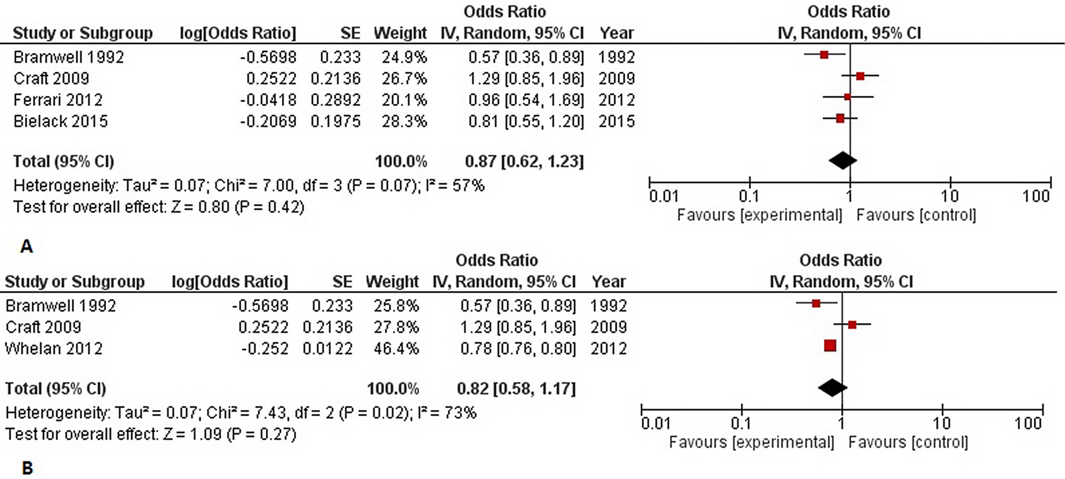 The 5-year OS rate was assessed in 4 studies (n = 1657). The forest plot, presented in Figure 4A, summarizes the overall ORs with non-statistically significant differences between the arms of comparison (OR = 0.87 (95% CI: 0.62–1.23), Z-test = 0.80, p = 0.420). Moderate heterogeneity was observed (I2 = 57%). The subgroup analysis of the 5-year OS rate after MAP chemotherapy compared to doxorubicin and cisplatin combination chemotherapy revealed a non-statistically significant difference (OR = 0.82 (95% CI: 0.58–1.17), Z-test = 1.09, p = 0.270), with moderate heterogeneity between the studies (I2 = 73%, χ2 = 7.43, p = 0.020) (Figure 4B).