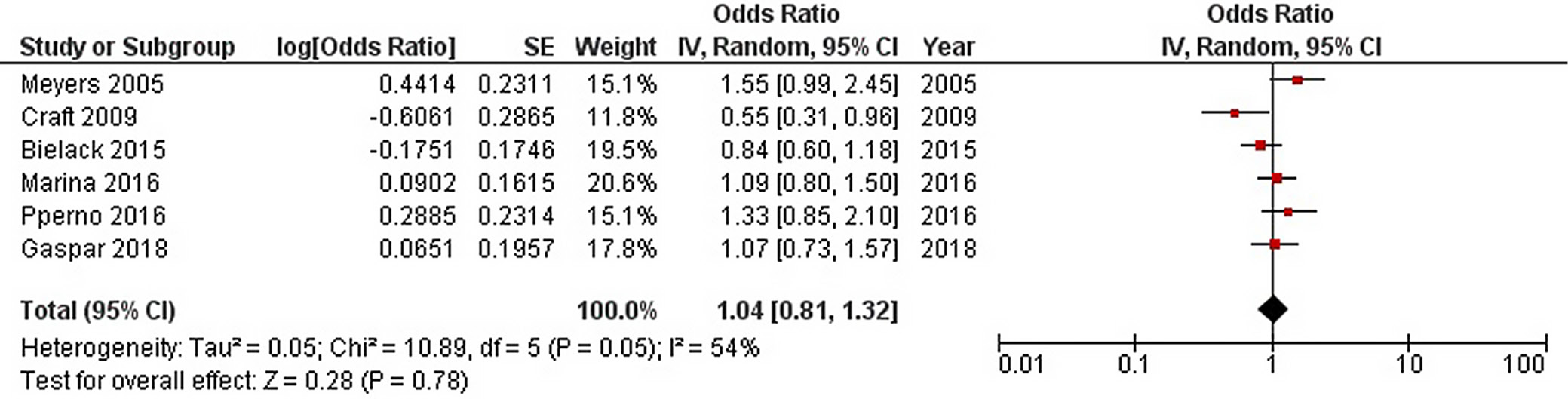 Six studies (n = 3001) reported data related to the 3-year EFS. The comparison of MAP chemotherapy regimens with other regimens revealed no significant differences, with an overall OR of 1.04 (95% CI: 0.81–1.32, Z-test = 0.28, p = 0.780). The estimated heterogeneity between studies was moderate (I2 = 54%) (Figure 5).