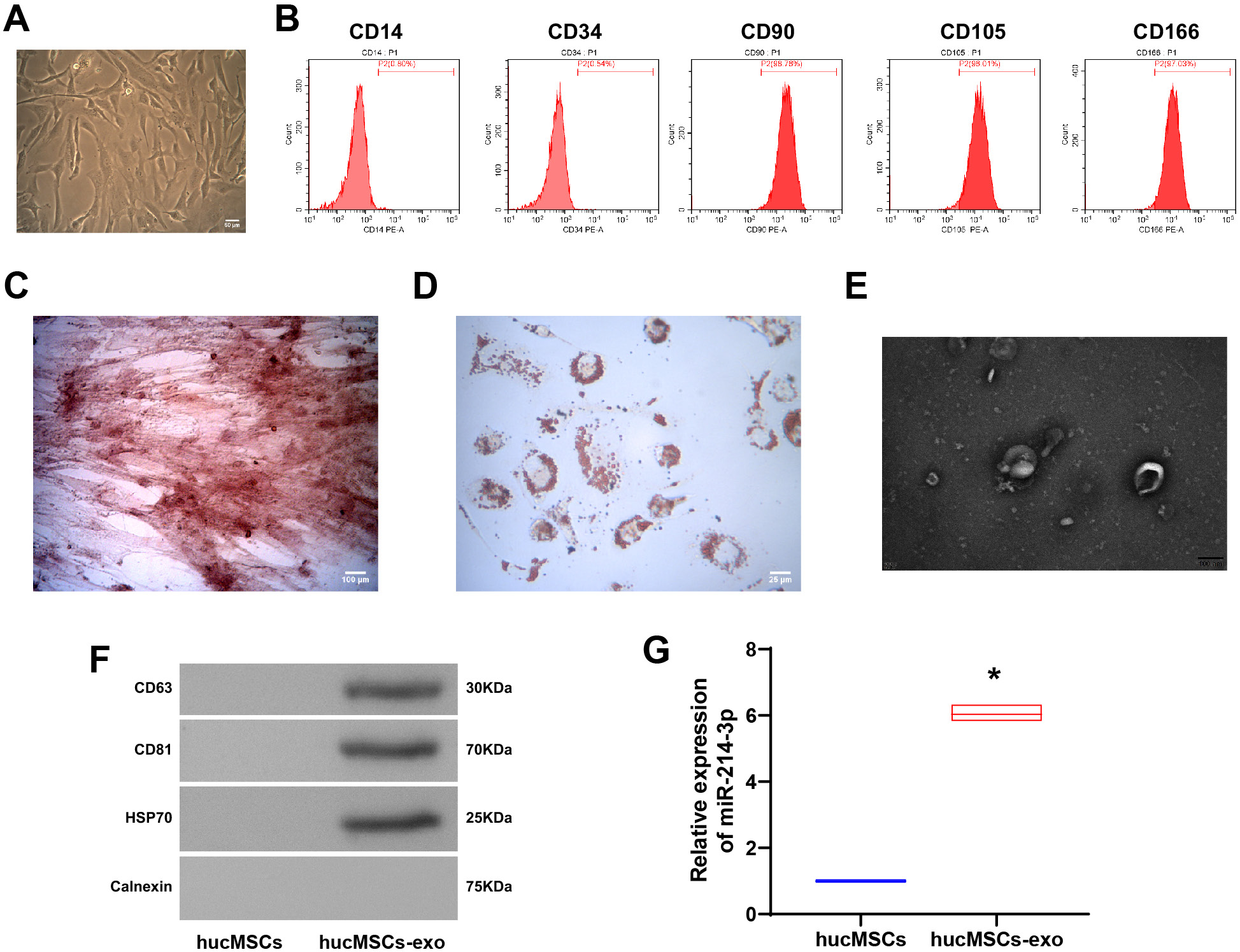 First, we performed cultures on the purchased hucMSCs. The cells showed shuttle-shaped, swirling growth (Figure 1A). Flow cytometry was used to detect the cell surface antigens CD14 (0.80%), CD34 (0.54%), CD90 (98.76%), CD105 (96.01%), and CD166 (97.03%) (Figure 1B). The hucMSCs showed osteogenic capacity (Figure 1C) and lipogenic capacity (Figure 1D). Transmission electron microscopy was used to observe the secretion of exosomes by huc-MSCs (TecnaiTM G2 Spirit BIOTWIN; Thermo Fisher Scientific). Exosomes were collected and were positive for exosome markers CD63, CD81 and HSP70, and negative for calnexin and elevated miR-214-3p expression (Figure 1E–G). All raw data are presented in Supplementary Table 1. In short, hucMSCs can secrete exosomal miR-214-3p.
