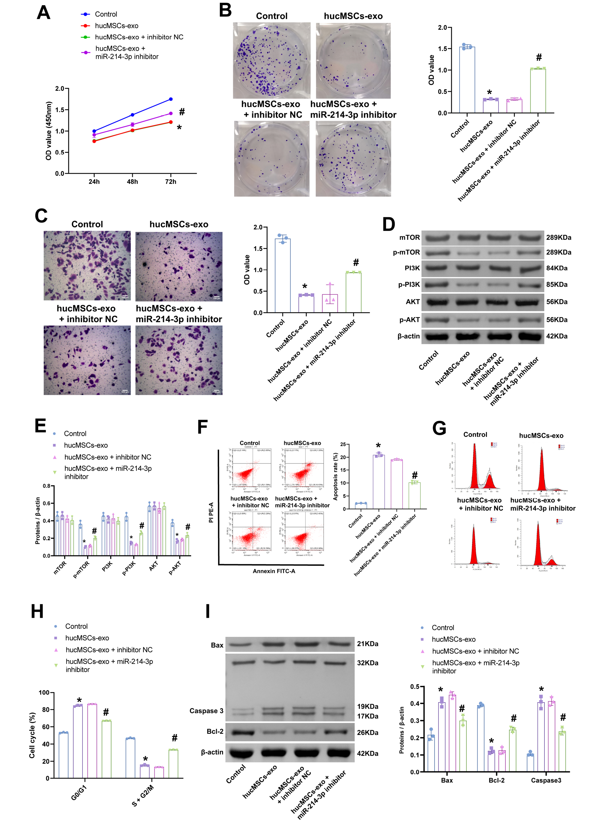 The above results indicated the presence of miR-214-3p in hucMSC exosomes. To investigate the effect of exosomal miR-214-3p on the development of cholangiocarcinoma, the GBC-SD cell line was selected for subsequent experiments. The addition of exosomes in GBC-SD resulted in a decrease in cell proliferation (Figure 2A), clonogenic ability (Figure 2B), invasive ability (Figure 2C), and an increase in the percentage of apoptosis (Figure 2F) and G0/G1 phase (Figure 2G,H). In contrast, after miR-214-3p silencing in GBC-SD, the proliferative, clonogenic and invasive capacities of the cells significantly increased after the addition of the exosomes in GBC-SD, while the percentage of apoptosis and S-phase decreased. The levels of p-mTOR, p-PI3K, p-AKT (Figure 2D,E), and Bcl-2 decreased, and the expression of Bax and caspase 3 increased under exosome intervention. Silencing of miR-214-3p increased the levels of p-mTOR, p-PI3K, p-AKT, and Bcl-2, and inhibited the expression of Bax and caspase 3 (Figure 2I). The data displayed in Figure 2 are also presented in Supplementary Table 2. In short, miR-214-3p in exosomes was able to inhibit the proliferation of GBC-SD cells.