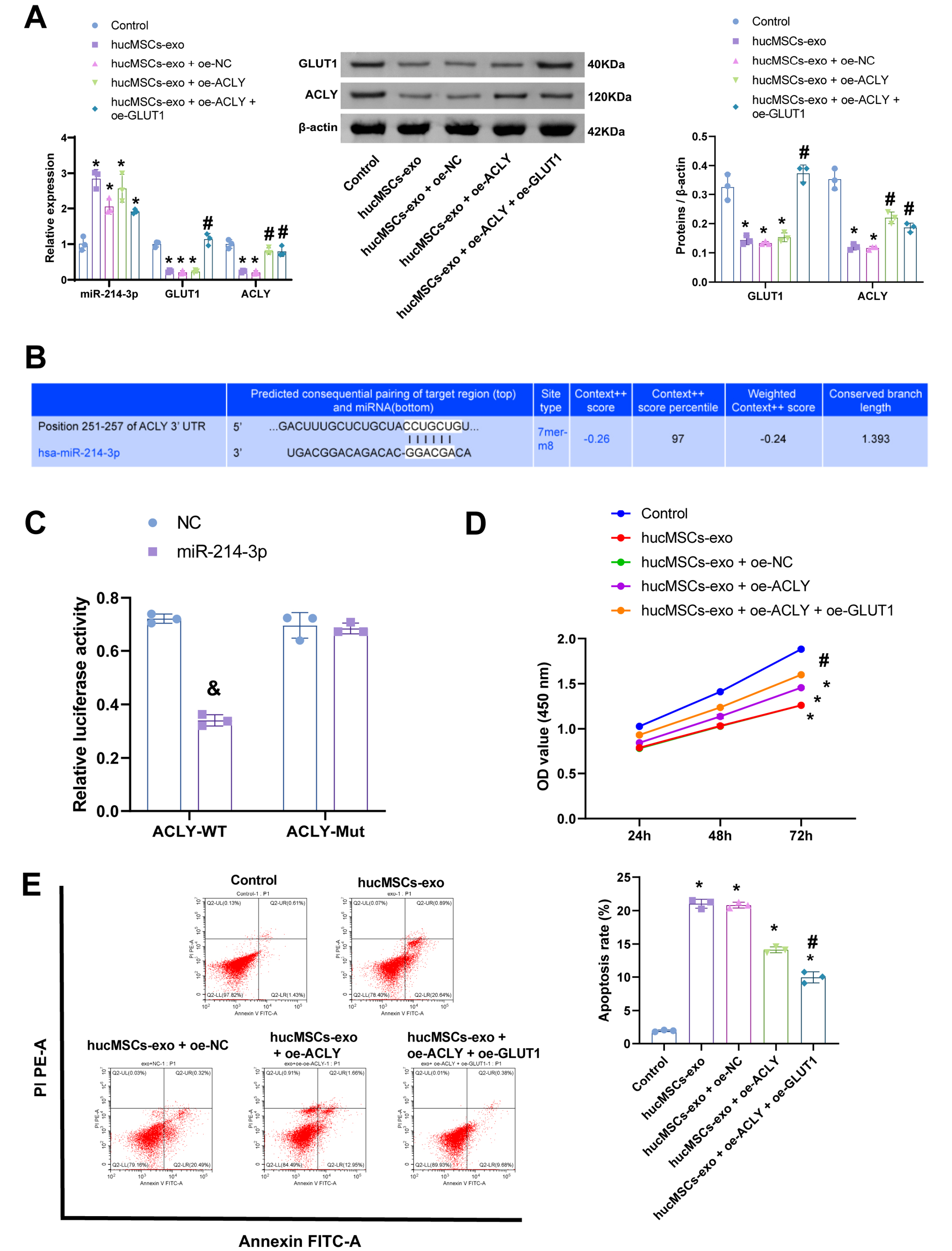The above experiments demonstrated that miR-214-3p can affect the proliferation and apoptosis of GBC-SD cells in exosomes. To investigate whether miR-214-3p can regulate the progression of GBC through ACLY/GLUT1, we constructed cell models overexpressing ACLY and GLUT1. The miR-214-3p expression levels were not affected by the overexpression of ACLY and GLUT1. Exosomal miR-214-3p inhibited ACLY and GLUT1 expression (Figure 3A,B). The miR-214-3p was shown to have base interactions on the TargetScan website (https://www.targetscan.org/; Figure 3C). Dual luciferase activity assays showed that miR-214-3p can target and inhibit the expression of ACLY (Figure 3D). The data showed that exosome-competent miR-214-3p inhibited the proliferation of GBC-SD cells (Figure 3E) and promoted their apoptosis (Figure 3, Figure while the overexpression of ACLY and GLUT1 cells reversed this effect. The source data and analysis results of Figure 3 are presented in Supplementary Table 3. In short, ACLY and GLUT1 can affect the proliferation and apoptosis of GBC-SD cells.