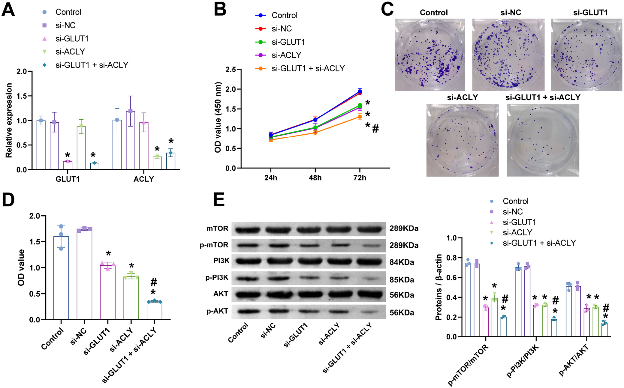 The above results showed that GLUT1 and ACLY were associated with the prognosis of GBC patients. We planned to investigate whether GLUT1 and ACLY could affect the function of GBC-SD in vitro. Firstly, we constructed GBC-SD cells with the silencing of GLUT1 and ACLY. The data presented in Figure 4A showed that the expression of GLUT1 and ACLY was inhibited in GBC-SD cells after silencing, indicating that the cell model was successfully constructed. Compared with the control and si-NC groups, the proliferative and clonogenic abilities of GBC-SD cells were reduced in the si-GLUT1 and si-ACLY groups, and the proliferative and clonogenic abilities of GBC-SD cells were more significantly reduced in the si-GLUT1+si-ACLY group (Figure 4B–D). Then, we examined the expression of proliferation-related genes, and the expression of p-mTOR, p-PI3K and p-AKT was significantly reduced in GBC-SD cells silenced with GLUT1 and ACLY (Figure 4E). The results of the data analysis displayed in Figure 4 are presented in Supplementary Table 4. In short, silencing of GLUT1 and ACLY inhibited the proliferative capacity of GBC-SD cells.