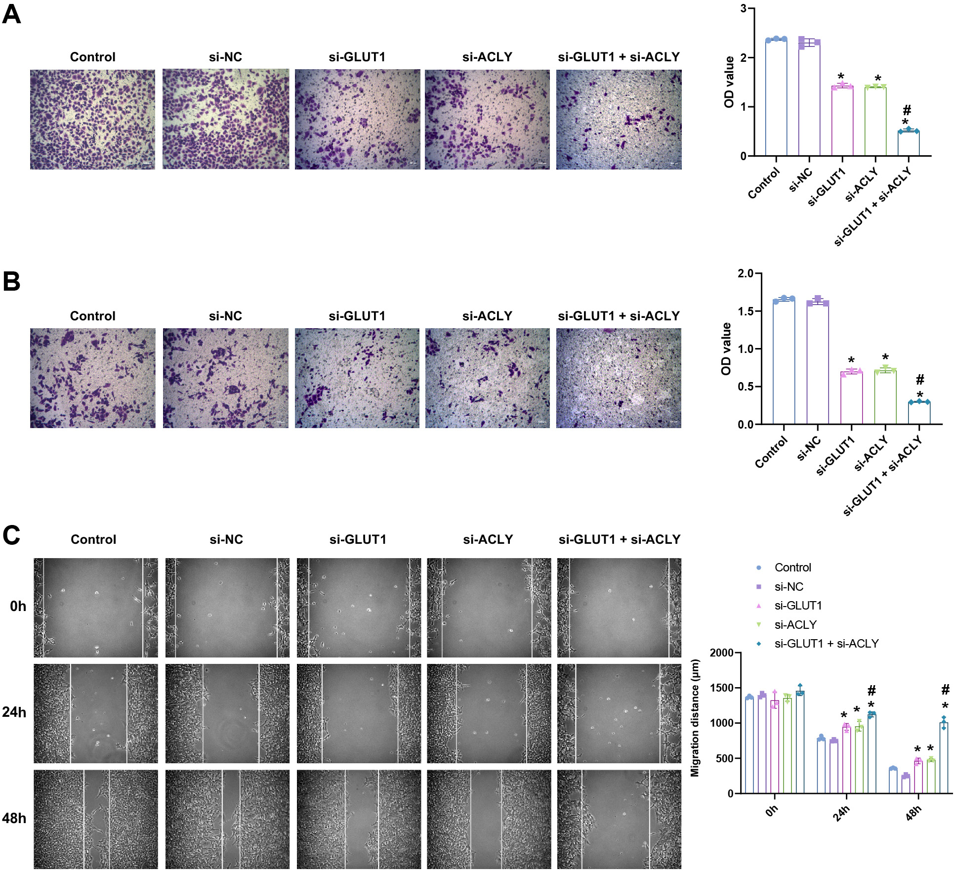The above results suggested that GLUT1 and ACLY can affect the proliferation of GBC-SD cells, thus whether silencing GLUT1 and ACLY can inhibit the proliferation of GBC-SD cells required further study. Transwell assays were used to detect the migration and invasion ability of GBC-SD cells. The experimental results demonstrated that the migration and invasion ability of GBC-SD cells were reduced in the si-GLUT1 and si-ACLY groups compared to the control and si-NC groups, and the reduction of migration and invasion ability of GBC-SD cells was more significant in the si-GLUT1+si-ACLY group (Figure 5A,B). The scratch assays were performed to measure the migration distance, and the migration distance of GBC-SD cells silenced with GLUT1 and ACLY was significantly lower (Figure 5C). The results displayed in Figure 5 are presented in Supplementary Table 5. In conclusion, silencing of GLUT1 and ACLY inhibited the migratory ability of GBC-SD cells.