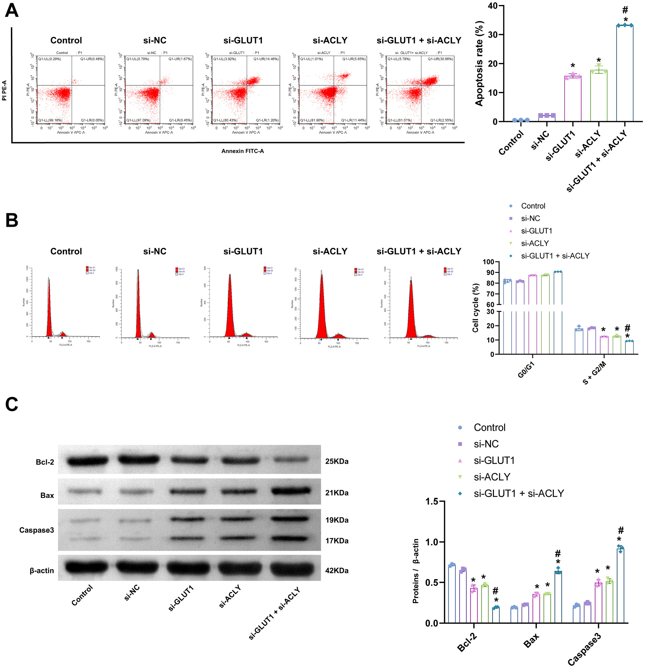 The above results suggested that GLUT1 and ACLY can affect the proliferation and migration of GBC-SD cells; thus, whether the silencing of GLUT1 and ACLY can promote apoptosis of GBC-SD cells required further investigation. Flow cytometry was used to detect the apoptosis rate of GBC-SD cells. Compared to the control and si-NC groups, the apoptosis rate of GBC-SD cells was elevated in the si-GLUT1 and si-ACLY groups, and the increase in the GBC-SD cell apoptosis rate was more significant in the si-GLUT1+si-ACLY group (Figure 6A). The results of the data in Figure 6B showed that the sum of S and G2/M phases of GBC-SD cells in the si-GLUT1 and si-ACLY groups were decreased compared to the control and si-NC groups, and the sum of S and G2/M phases of GBC-SD cells in the si-GLUT1+si-ACLY group was decreased more significantly. Western blot was utilized to analyze the expression of apoptosis-related proteins. The expression of Bax and caspase 3 was significantly increased, while the expression of Bcl-2 was significantly decreased in GBC-SD cells silenced with GLUT1 and ACLY (Figure 6C). The results displayed in Figure 6 are presented in Supplementary Table 6. All in all, silencing of GLUT1 and ACLY promoted apoptosis in GBC-SD cells.
