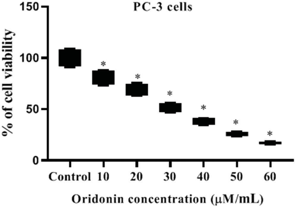 The cytotoxicity of a range of ORD concentrations (10 μM/mL, 20 μM/mL, 30 μM/mL, 40 μM/mL, 50 μM/mL, and 6 0μM/mL) on human PC-3 cells was determined using the MTT assay. The results revealed that ORD had a concentration-dependent anti-proliferative action on PC-3 cells. Untreated control cells did not experience any anti-proliferative effect and showed 100% PC-3 cell proliferation. However, 10 μM, 20 μM, 30 μM, and 40 μM ORD dosages substantially (p < 0.05) inhibited PC-3 viability compared to the untreated control. Furthermore, viability was inhibited further by administering a high dosage of ORD (50 μM and 60 μM), leading to cellular damage.