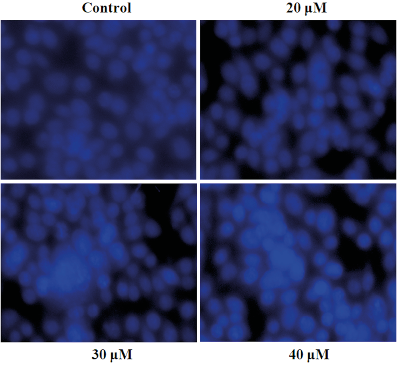 Assessment of ORD (20 µM/mL, 30 µM/mL and 40 µM/mL) on PC-3 cell morphological apoptotic features utilized DAPI staining. Control cells stained with DAPI were viable with normal nuclei. In contrast, ORD-treated PC-3 cells appeared apoptotic, based on nuclear morphology and body disintegration. Furthermore, PC-3 cells exposed to ORD (20 µM/mL, 30 µM/mL or 40 μM/mL) displayed chromatin condensation, membrane blebbing, nuclear envelop impairment, fragmentation, and cellular collapse in a concentration-dependent manner. These results demonstrated that ORD exhibits anti-proliferative and apoptotic activity on PC-3 cells in a dose-dependent way (Figure 2).