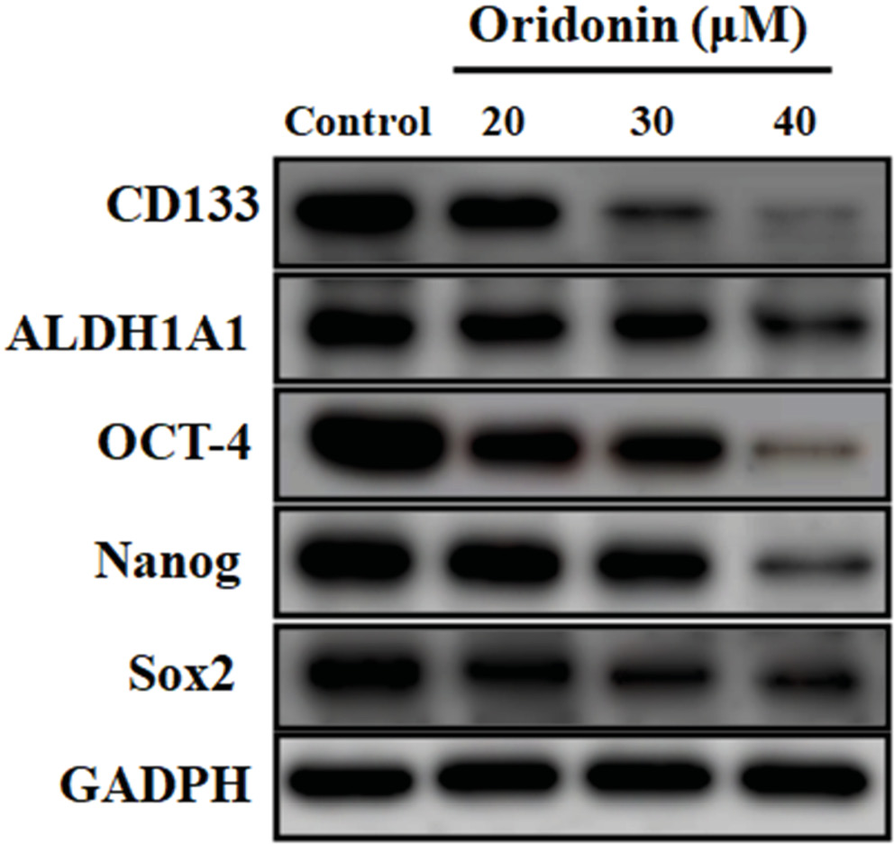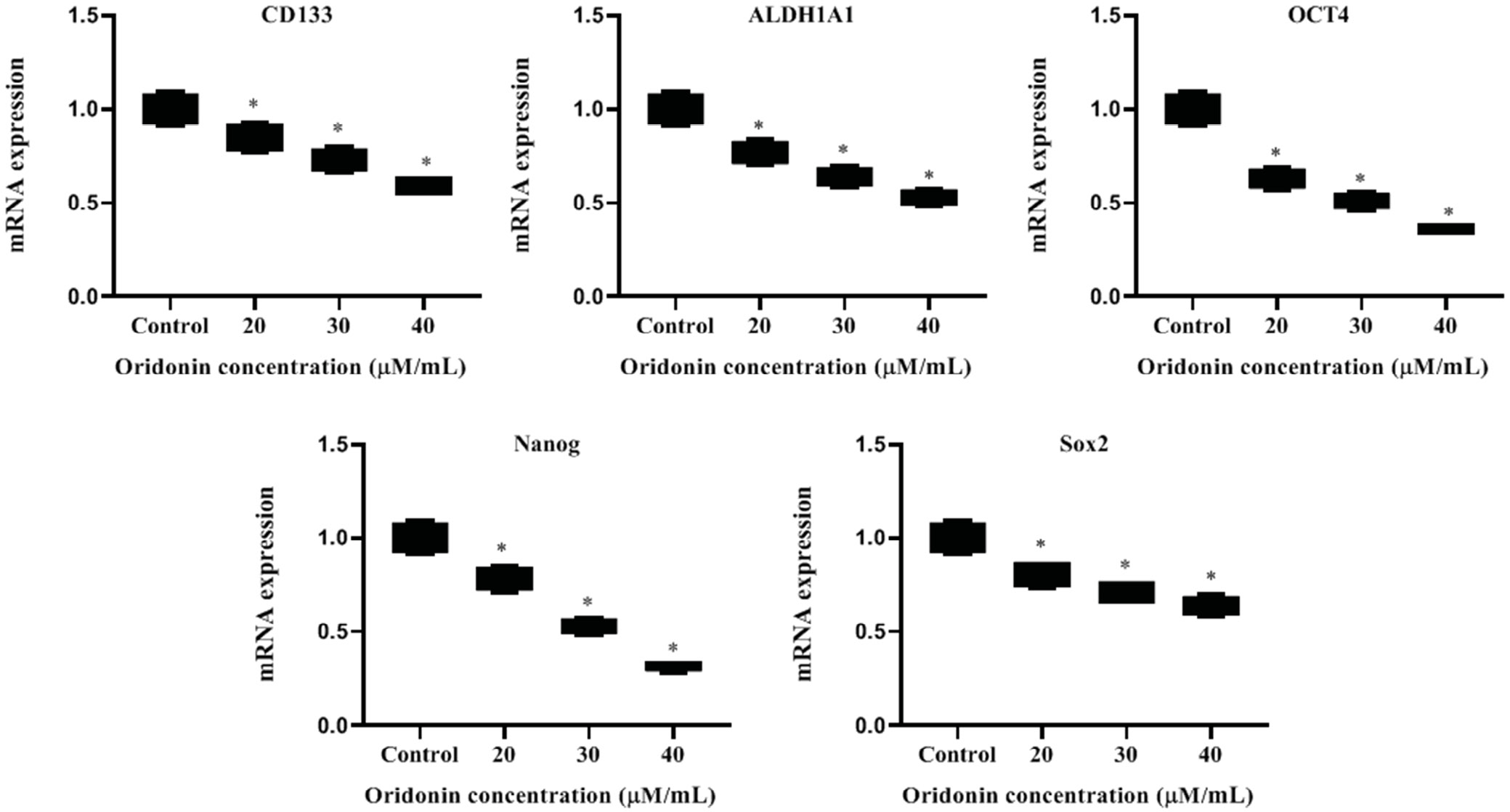 We evaluated the effect of ORD on the protein and mRNA levels of PCC markers. Western blot and qPCR assays indicated that ORD attenuated the levels of protein and messenger (m)RNA of CD133, Oct-4, Sox2, ALDH1A1, and Nanog in a concentration-dependent manner (Figure 3, Figure 4). These findings demonstrated that ORD could suppress PCC activity.