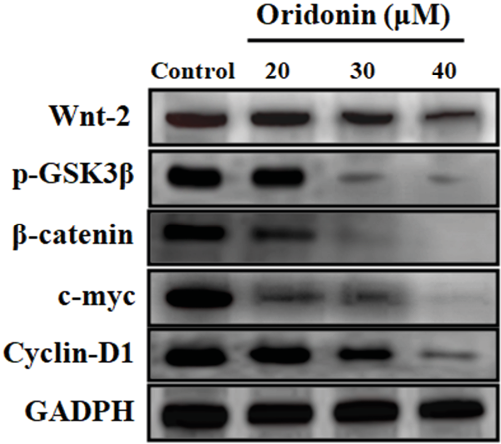 Wnt/β-catenin signaling is a crucial pathway for controlling PC-3 cell actions. Accordingly, we investigated whether the anti-proliferative activities of ORD on PC-3 cells were facilitated by the Wnt/β-catenin pathway. The findings indicated that ORD repressed Wnt-2, β-catenin and p-GSK3β protein levels, and attenuated cyclin-D1 and c-myc genes (Figure 5).