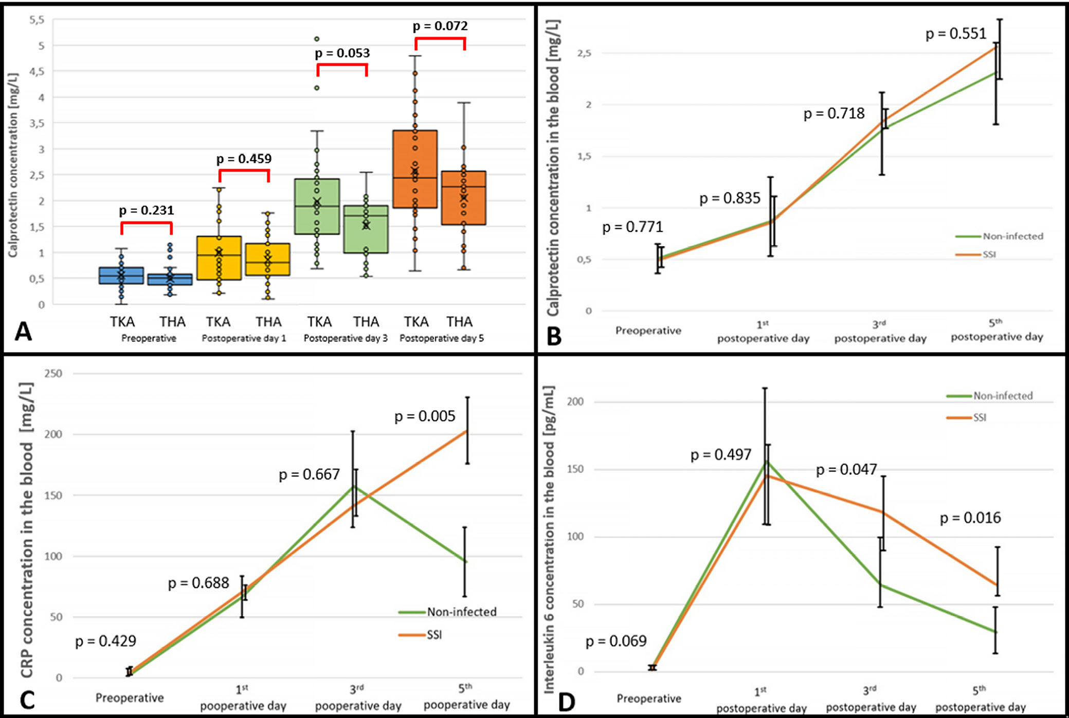 2. A significant difference in median values and the course of the curve patterns between the non-complicated and SSI groups was not observed. There is a need to verify our findings and the potential value of CLP in the diagnosis of PJI/SSI on a larger group of patients to determine when the peak, the start of concentration decrease and its normalization occurs after elective TJAs.