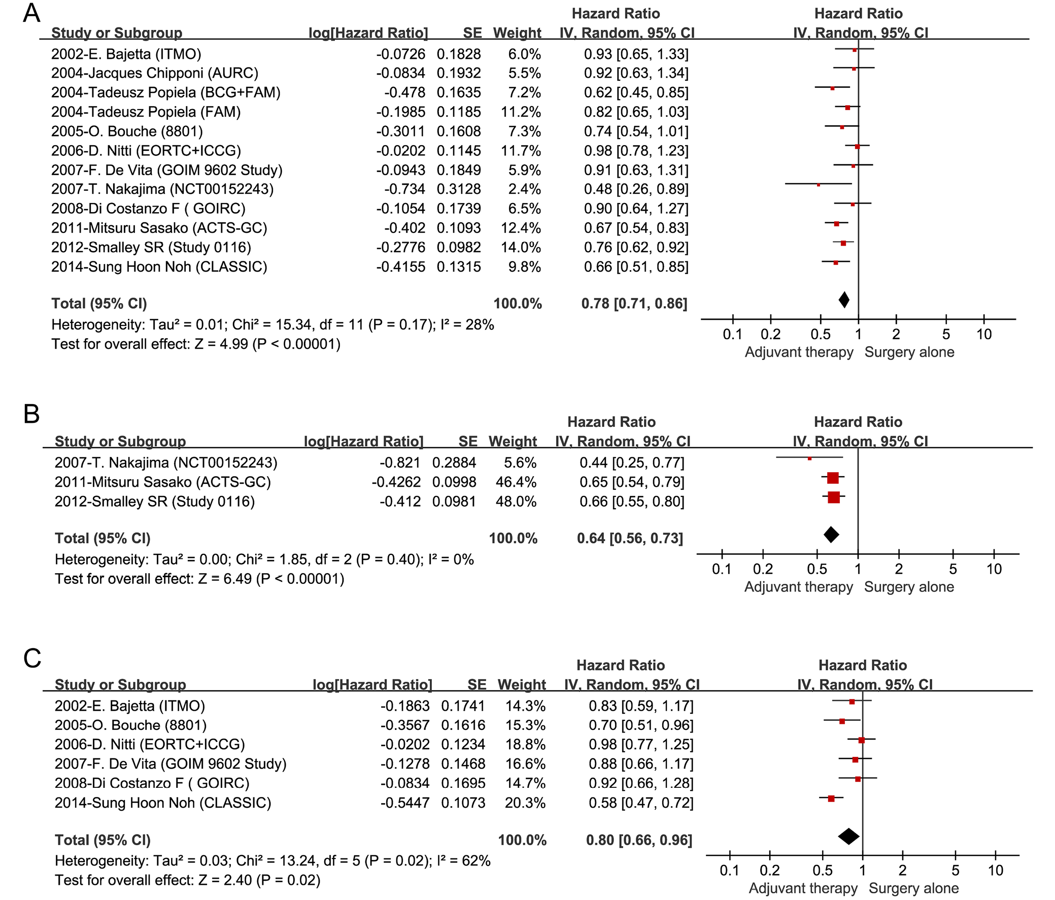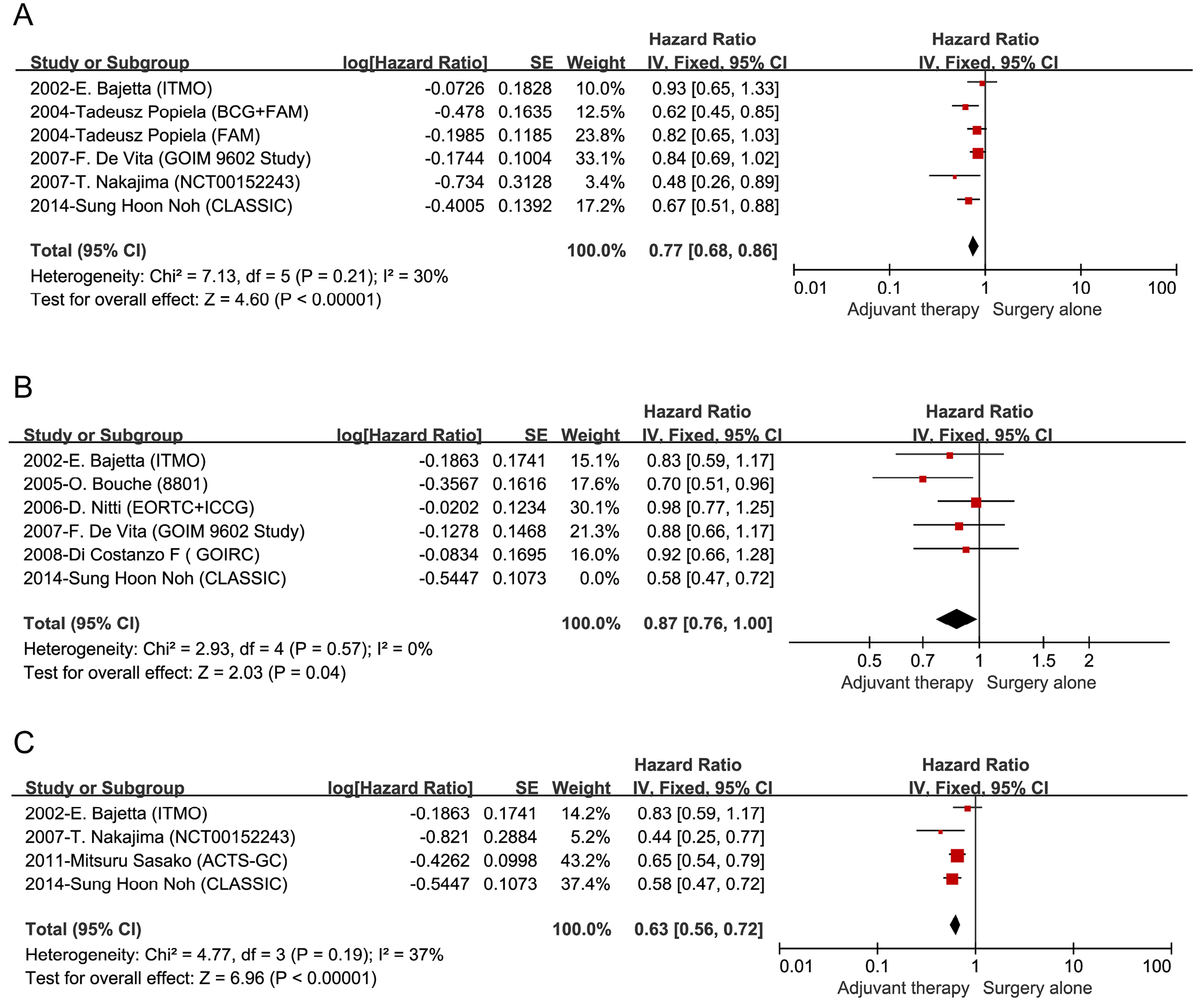Objectives. To compare the overall survival (OS), relapse-free survival (RFS) and disease-free survival (DFS) of patients with local-advanced GC (LAGC) after surgery plus adjuvant therapy and with surgery alone based on meta-analysis.