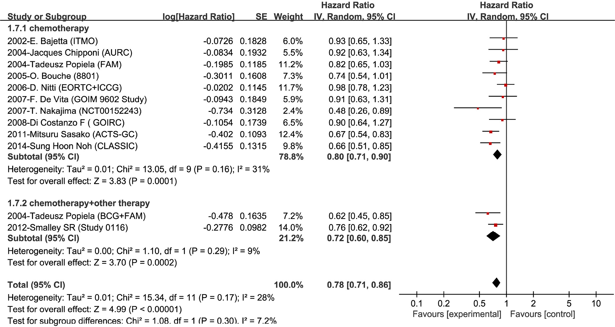 In addition to chemotherapy, we divided the 12 sets of data into 2 subgroups based on the combination of other adjuvant therapies (i.e., radiotherapy or immunotherapy). Subgroup analysis indicated that patients receiving postoperative chemotherapy plus radiotherapy or immunotherapy presented a significant increase in 5-year OS rate than those only receiving chemotherapy (HR = 0.72; 95% CI: 0.60–0.85; p < 0.001; Figure 3).