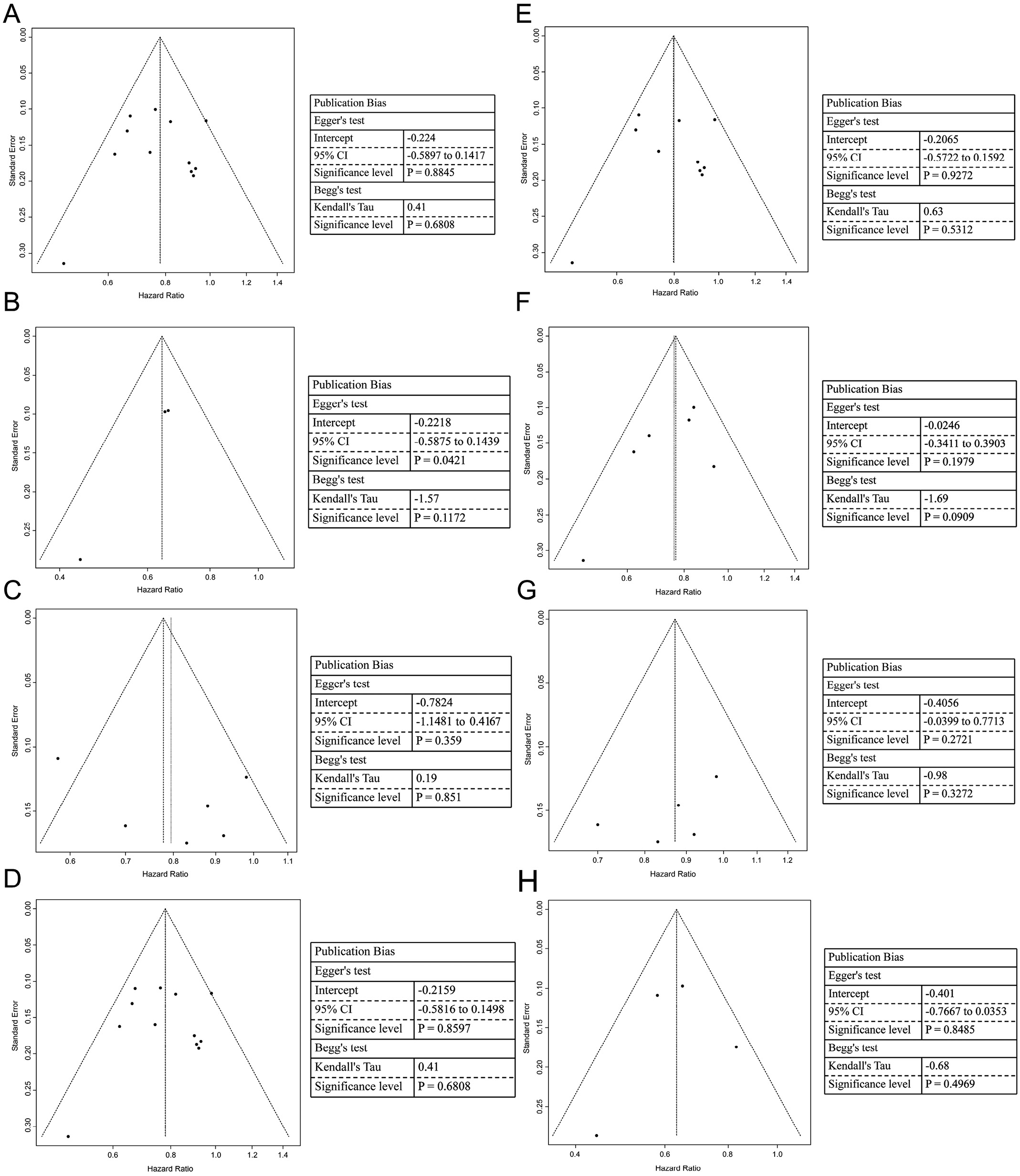 As shown in Figure 5, together with the Egger’s and Begg’s tests, the publication bias in these studies was low. Egger’s regression test determined the degree of asymmetry in the funnel plot by measuring the intercept of a standard normal regression that deviated from precision. The Begg’s rank correlation test explained the correlation between the rank of the effect size and its variance. A p-value of more than 0.05 demonstrated statistical difference with a low risk of publication bias. In this study, the p-values for the Begg’s test and Egger’s test in most of the groups were more than 0.05. However, p-value for the Begg’s test in the studies listed in Figure 2B was 0.1172, and p-value for the Egger’s test was 0.0421 (Figure 5B), which may be related to the minor trials in this group. The funnel plots of 12 trials listed in Figure 2A were symmetric, and the p-values for the Begg’s test and Egger’s test were 0.885 and 0.680, respectively (Figure 5A). Meanwhile, the p-values for the Begg’s test and Egger’s test for the studies listed in Figure 2C were 0.851 and 0.359 (Figure 5C), while those for the studies listed in Figure 3 (chemotherapy and chemotherapy and other therapy) were 0.680 and 0.860 (Figure 5D), respectively. The p-values for the Begg’s test and Egger’s test for chemotherapy of the study listed in Figure 3 (chemotherapy only) were 0.531 and 0.927 (Figure 5E), while those for the studies listed in Figure 5A were 0.091 and 0.198 (Figure 5F), those listed in Figure 5B were 0.327 and 0.272 (Figure 5G), and those listed in Figure 5C were 0.497 and 0.858 (Figure 5H), respectively. These data mostly indicated a low risk of publication bias.