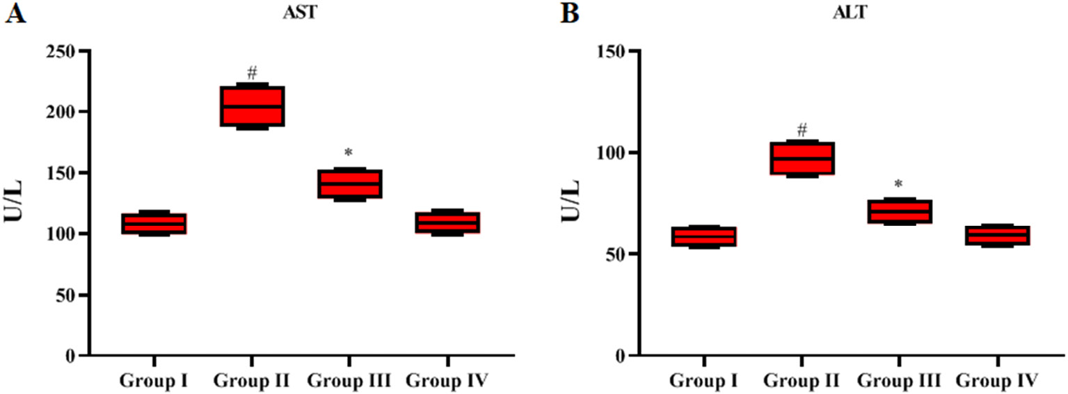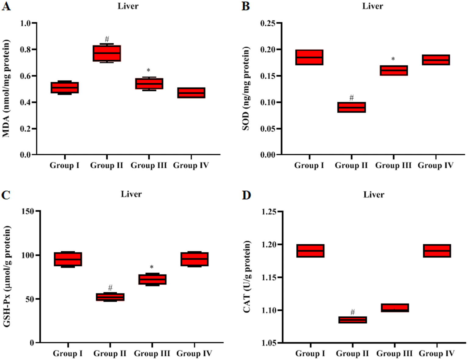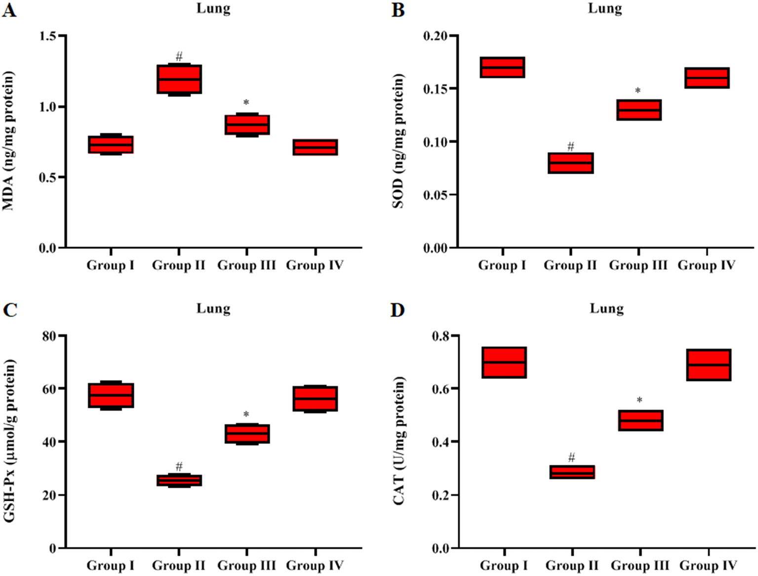 The blood of the rats was drawn through cardiac puncture and centrifuged at 4,000 rpm. The serum was separated and preserved at −80°C. The residual serum was recollected at 4°C to estimate hepatic markers. Tissues (liver, kidney and lung) were dissected and divided into 2 parts. One portion was kept at −80°C for antioxidant assessments. The second part of the tissues was fixed in 10% formalin for histopathological assessment.35