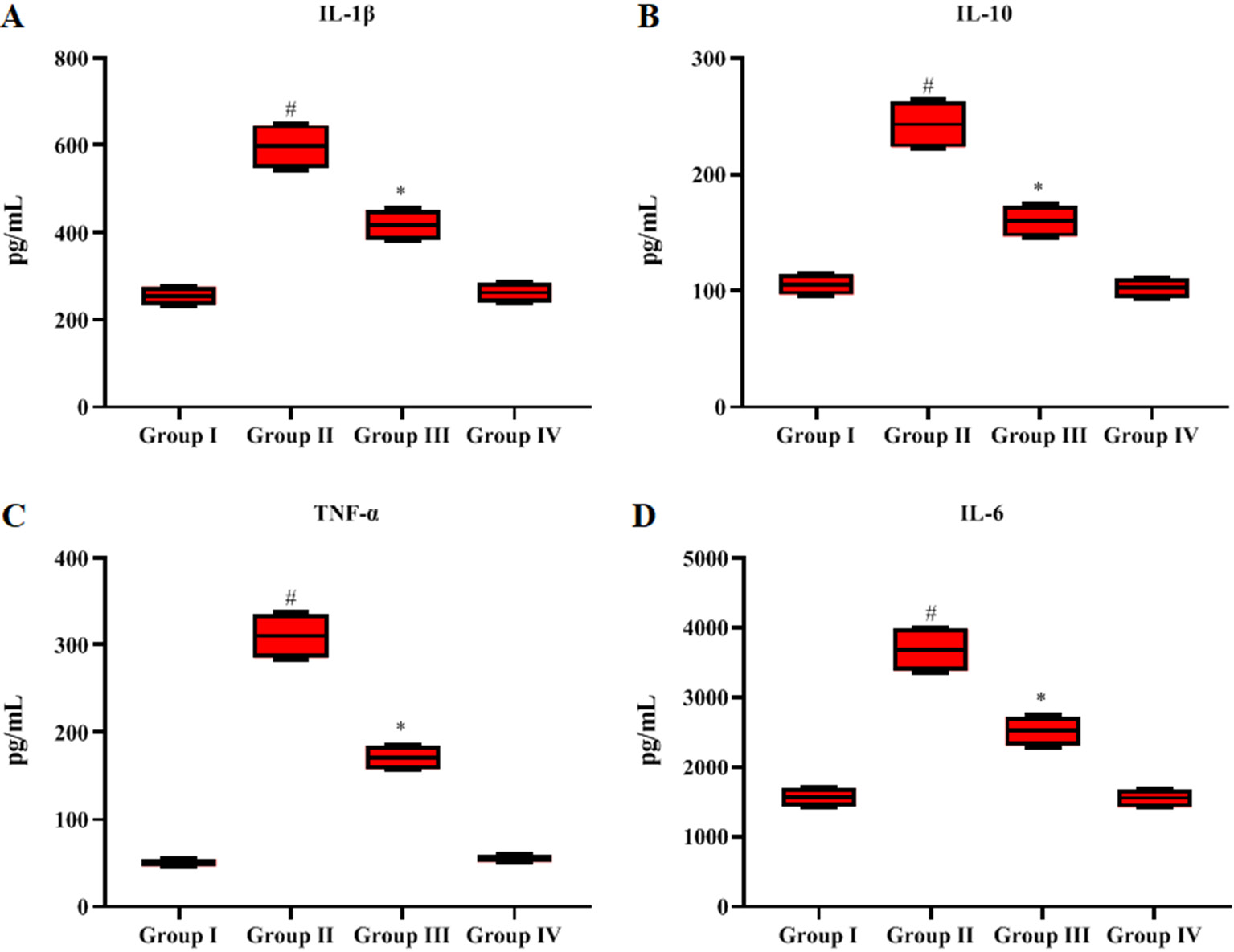 The serum cytokines, namely IL-6, IL-10, IL-1β, and TNF-α, were significantly elevated (p < 0.05) in LPS-induced sepsis animals (Figure 2A–D). The cytokine levels declined in the GN+LPS-prompted septic rats. Cytokine levels in control rats and GN alone-treated rats were similar.