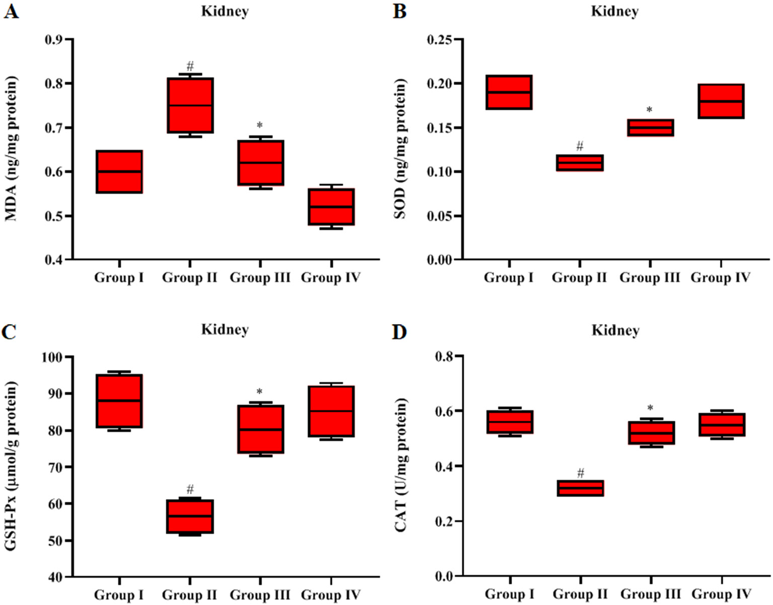 For biochemical analyses, tissues of the rats’ liver, kidney and lung were washed with deionized ice-cold water. One gram of tissue sample was treated with phosphate-buffered saline (PBS, pH: 7.2, 1:9 ratio) and was homogenized. Afterward, the homogenate was centrifuged for 1 h, and the supernatant was analyzed. Malondialdehyde, CAT, SOD, and GSH-Px were determined by the kits acquired from Elabscience (Wuhan, China). Cytokine levels were quantified by enzyme-linked immunosorbent assay (ELISA) kit (Cayman Chemical, Ann Arbor, USA) as per the manufacturer’s protocol. Toxicity markers (aspartate aminotransferase (AST) and alanine transaminase (ALT)) were assayed using kits delivered by Cayman Chemical, according to the manufacturer’s instruction.