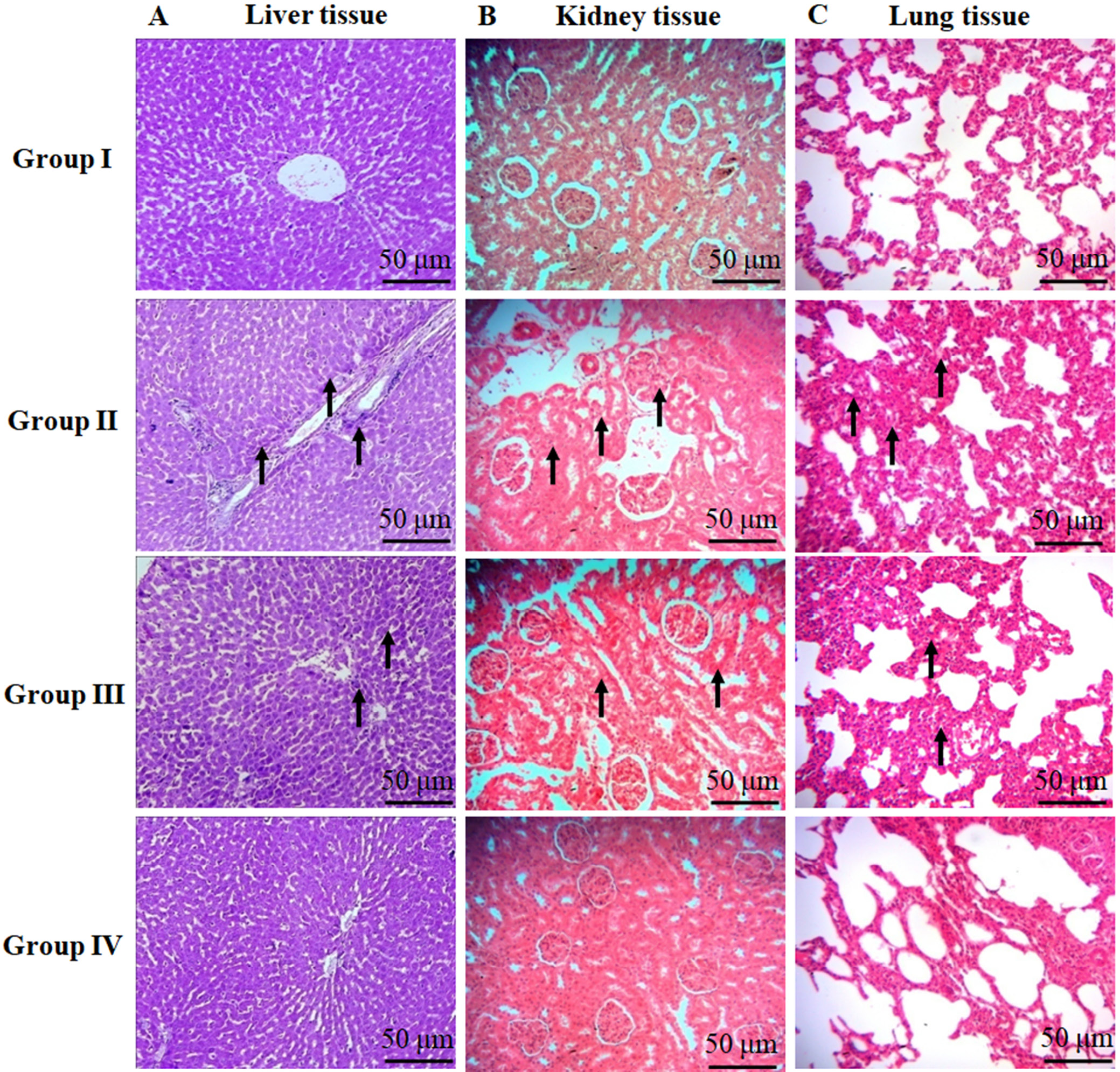Liver, kidney and lung tissues were preserved with formaldehyde (10%), fixed in paraffin blocks, cut into slices, and stained with hematoxylin and eosin (H&E). Successively, stained tissues were identified for histological changes and inflammation under a light microscope (model CX33; Olympus Corp., Tokyo, Japan).