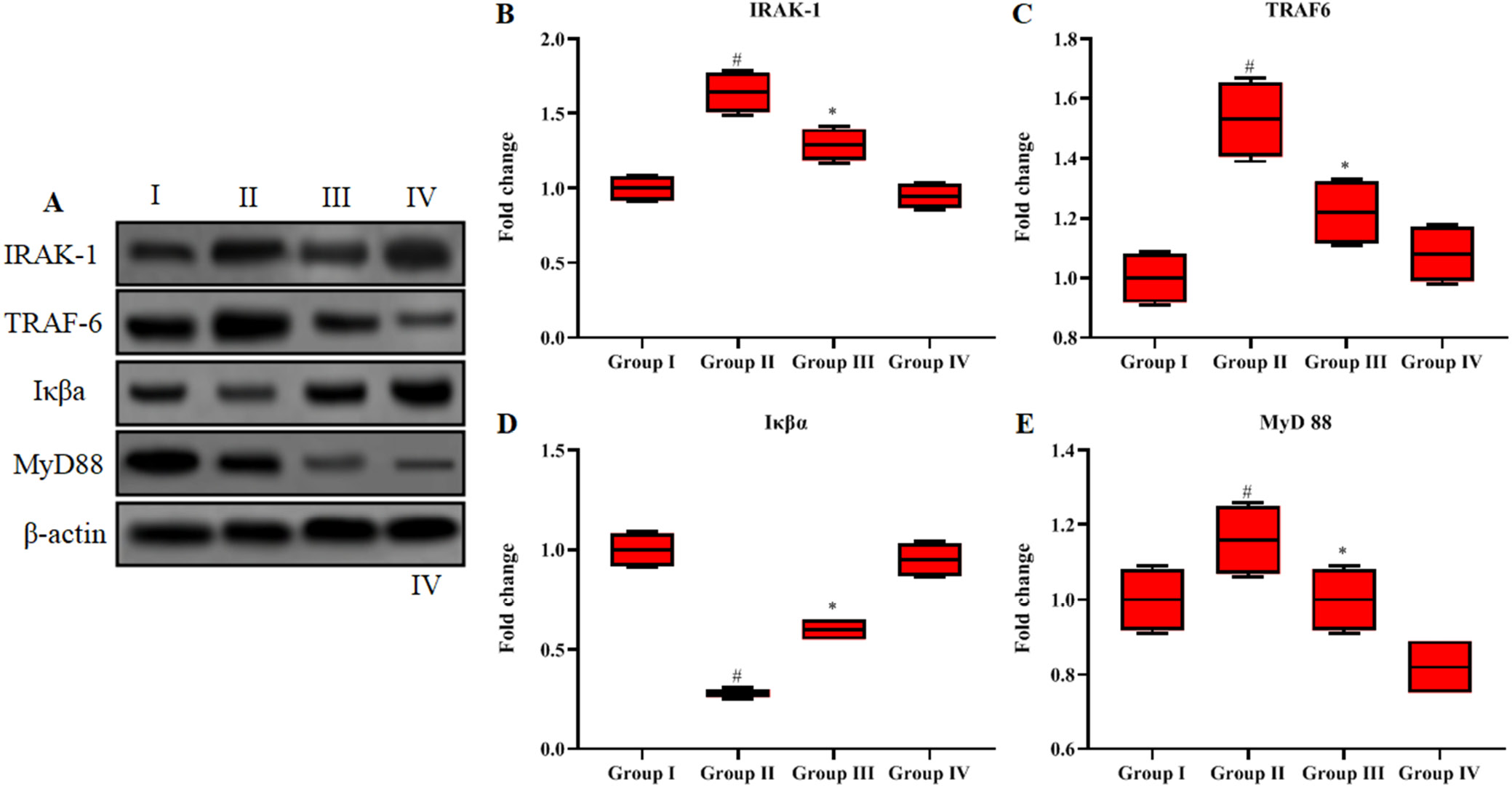 In the western blot analysis, we found that the protein levels of IRAK-1, TRAF-6 and MYD88 were augmented, whereas Iκβα levels declined in the hepatic tissues of LPS-prompted sepsis animals (Figure 8A–E). It was observed that GN reduced IRAK-1, TRAF-6 and MyD88 levels, and enhanced Iκβα protein levels in hepatic tissues. The stimulation of NF-κB is regulated by Iκβα proteins, and they inhibit NF-κB triggering. The Iκβα expression was suppressed in LPS-induced septic rats. Gedunin inhibited the degradation of Iκβα.