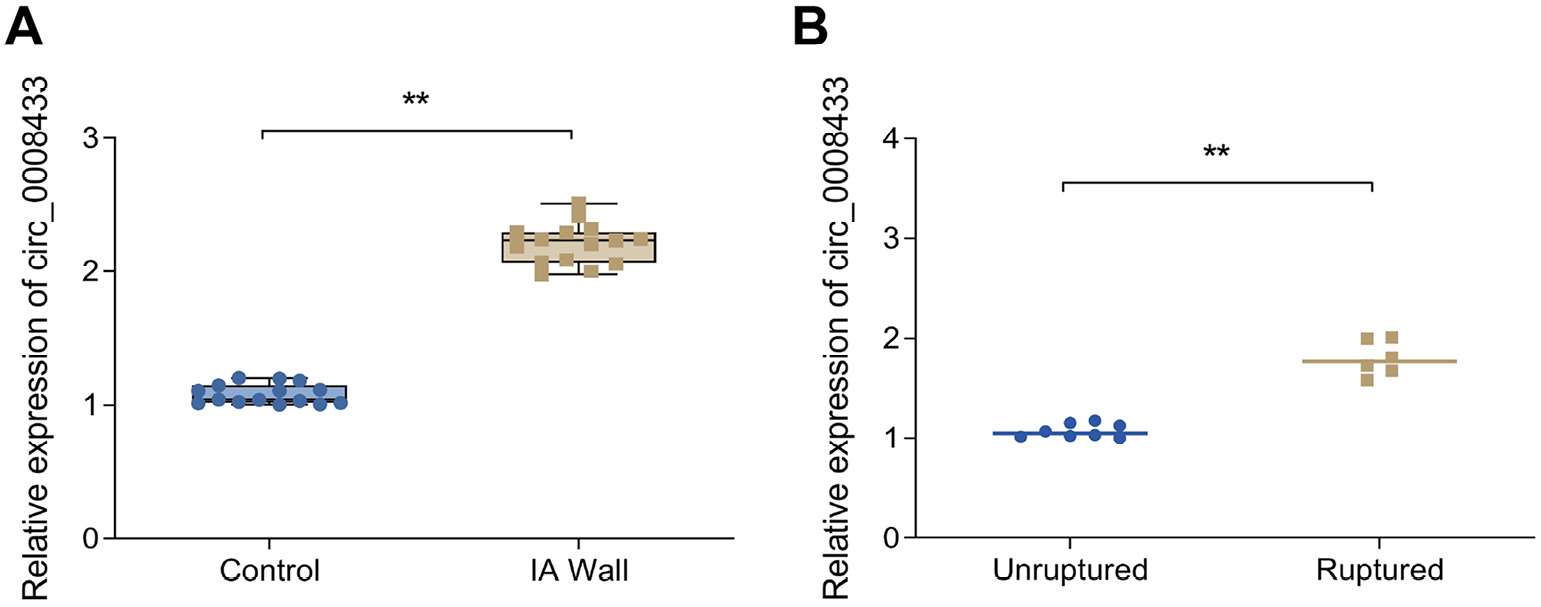 Results. The RT-qPCR analysis confirmed that hsa_circ_0008433 was significantly upregulated in IA tissues, especially in ruptured samples (p < 0.05). Overexpression of hsa_circ_0008433 in HBVSMCs promoted proliferation, migration and phenotype switching, indicated by increased expression of MMPs and decreased contractile proteins. The effects were reversed by the knockdown of hsa_circ_0008433.