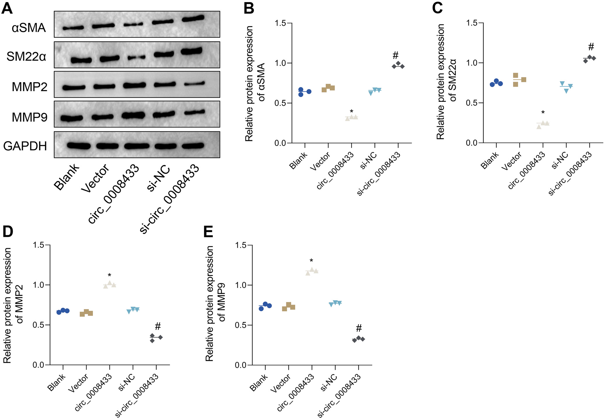 To investigate the effect of hsa_circ_0008433 on the phenotype switching of HBVSMCs, we assessed the expression levels of key proteins associated with this process. There were no significant differences in α-SMA, SM22α, MMP-2, and MMP-9 expression levels among the blank, vector and si-NC groups. However, the overexpression of hsa_circ_0008433 led to a significant decrease in α-SMA and SM22α levels and an increase in MMP-2 and MMP-9 levels, as compared to the vector group (Figure 3A–C, Table 6 and Supplementary Tables 5–7). Conversely, knockdown of hsa_circ_0008433 resulted in increased α-SMA and SM22α levels and decreased MMP-2 and MMP-9 levels, compared to the si-NC group (Figure 3A,D,E and Supplementary Tables 8–11). These findings suggest that hsa_circ_0008433 overexpression promotes phenotype switching in HBVSMCs, favoring a shift towards a pro-inflammatory state.