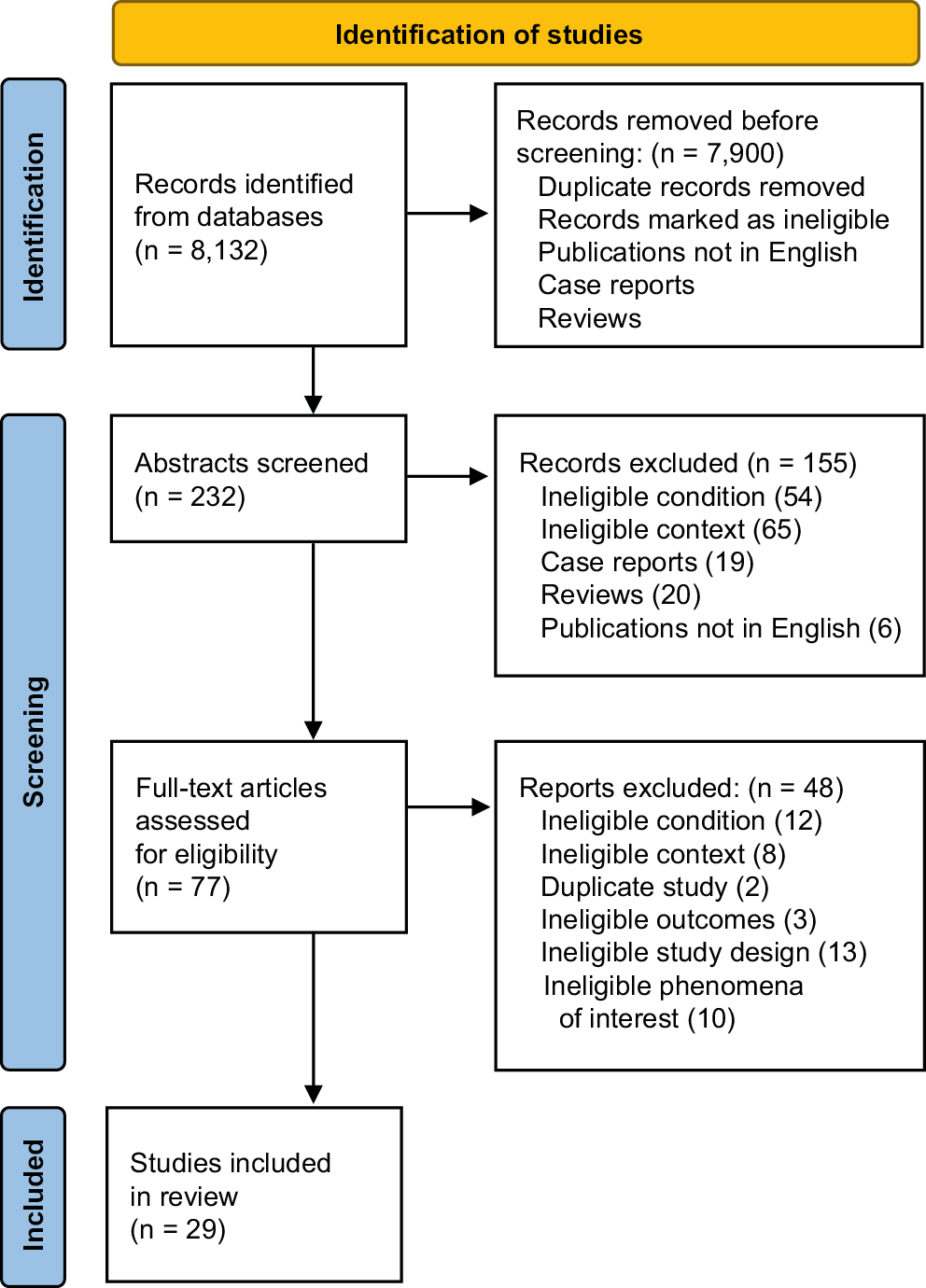 The search resulted in 8,132 studies, of which 232 abstracts were reviewed. Of the abstracts screened, 54 were ineligible condition, 65 were ineligible context, 19 were case reports, 20 were reviews, and 6 were not in English. Seventy-seven studies were subject to a full eligibility assessment. Our review ultimately included 29 articles; 12 studies showed ear dysfunction, 11 described nose dysfunction and 6 showed pharynx dysfunction. Included articles described ENT symptoms of hearing dysfunction, vestibular function disorders, cerebrospinal fluid leak, Eustachian tube (ET) dysfunction, rhinosinusitis, olfaction and taste disorders, dysphagia, dry mouth symptom, and gastroesophageal reflux disease (GERD). A summary of the included studies and quality of ENT symptoms in OSAS and relevant findings are presented in Table 1 and Table 2.3, 4, 5, 6, 7, 8, 9, 10, 11, 12, 13, 14, 15, 16, 17, 18, 19, 20, 21, 22, 23, 24, 25, 26, 27, 28, 29, 30, 31