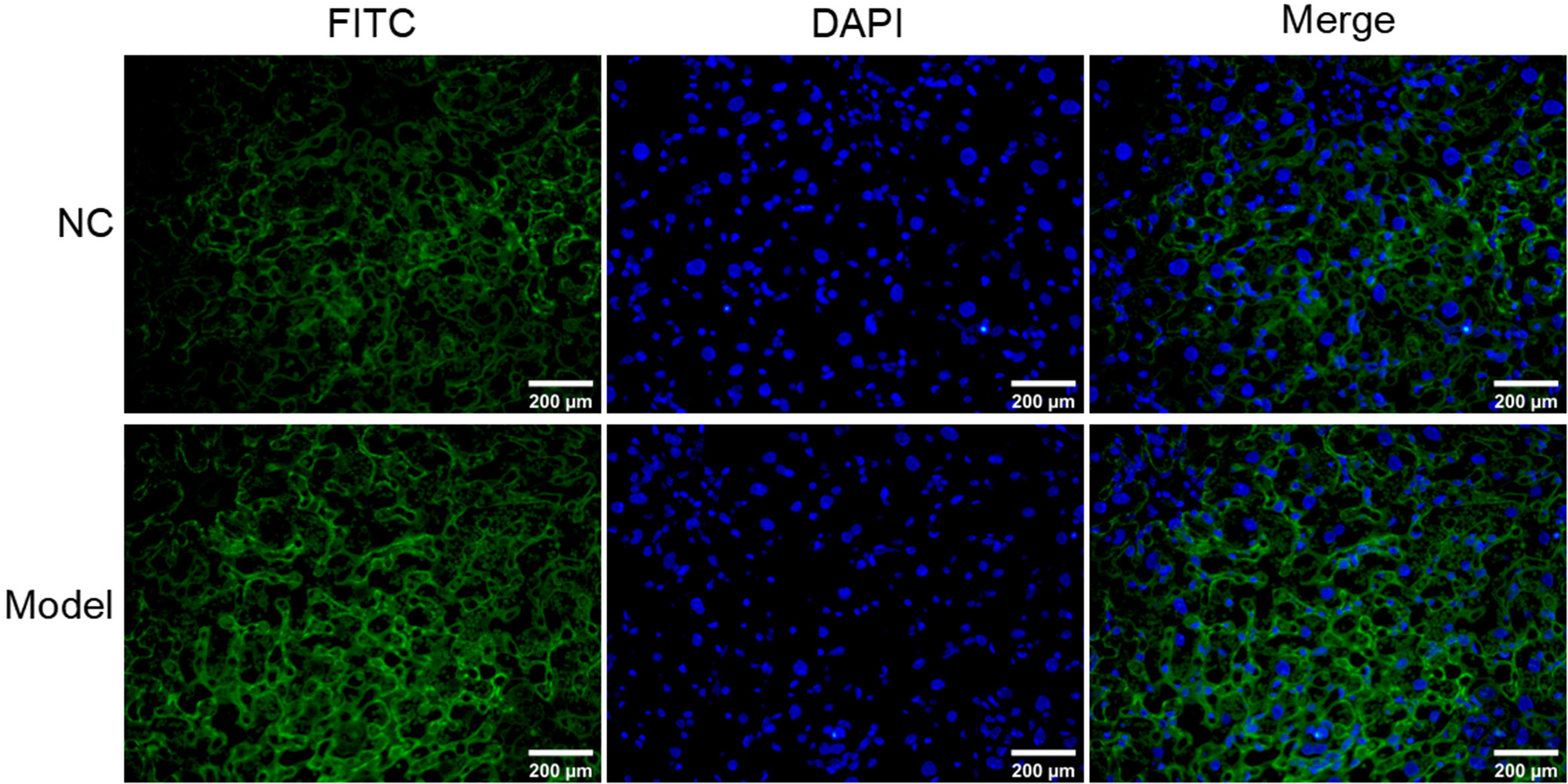 Additionally, TUNEL staining was used to observe the level of apoptosis in chorionic trophoblast tissues across each group of rats. Compared to the NC group, the TUNEL fluorescence signal in the chorionic trophoblast tissues significantly increased after 7 days of subcutaneous L-NAME injection (Figure 2). These results indicate a marked upregulation of level of apoptosis in the chorionic trophoblast tissues of the model group.