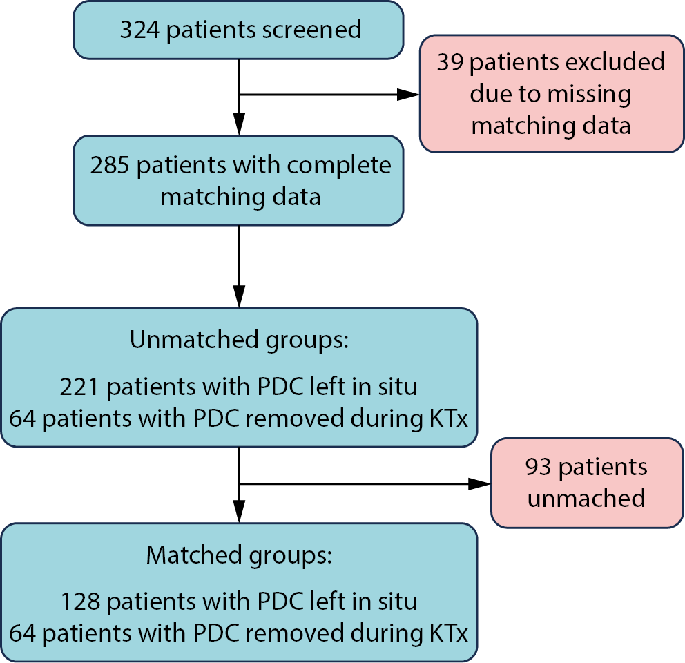 Retrospective data concerning adult (≥18 years old) renal graft recipients previously managed with peritoneal dialysis were collected from patient’s medical records across 5 kidney transplant centers in Poland. Patients transplanted between 2010 and 2021 were considered eligible for inclusion, ensuring at least 1 year of follow-up. We excluded patients with PDCs removed more than 1 day before the transplant procedure, those who underwent multiorgan transplantation, or individuals with Bricker ileal conduit urinary diversion. Patients with unknown group assignment (no information on whether the PDC was removed at the time or after kidney transplantation) or with missing matching variables were also excluded from the final analyses.