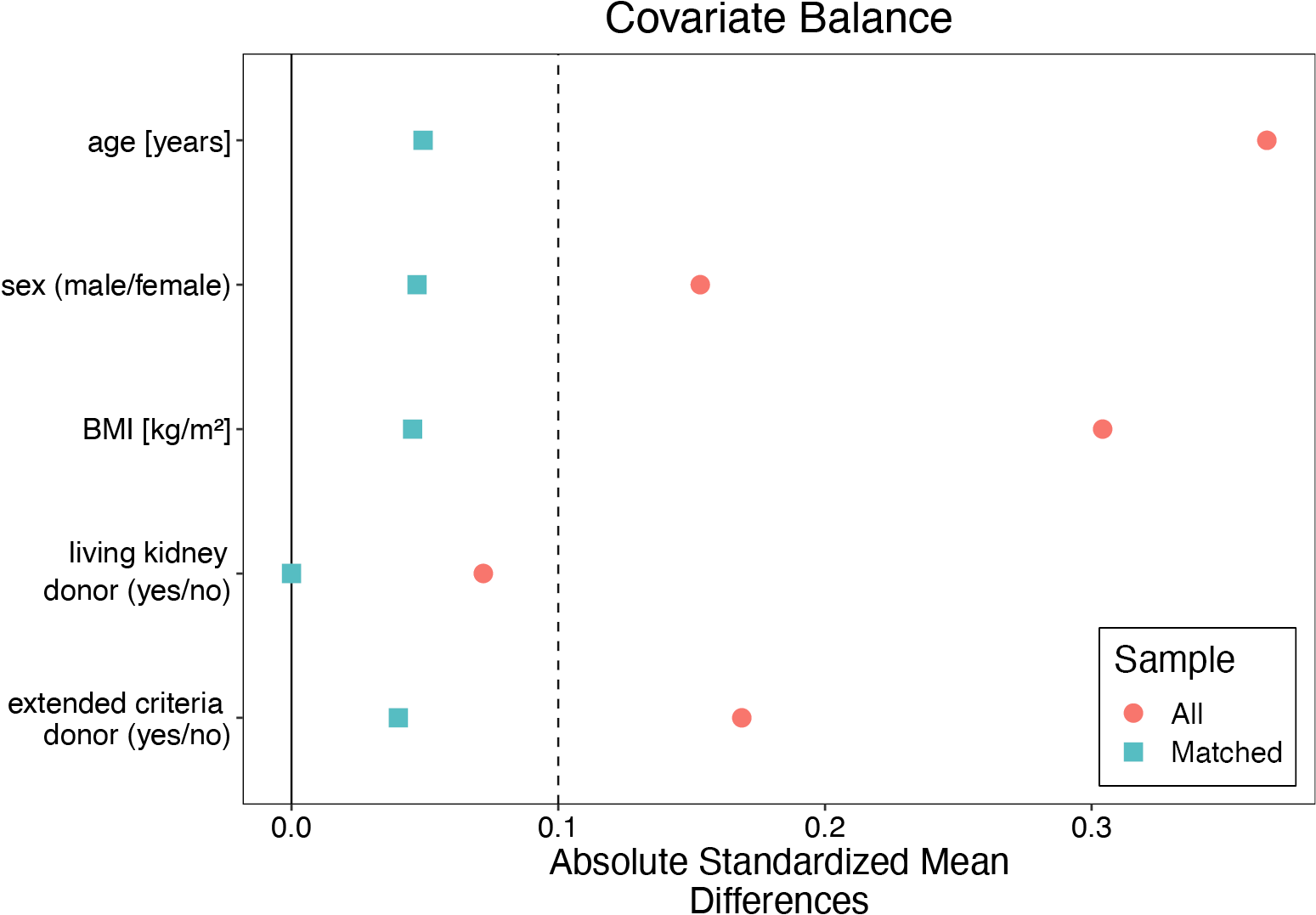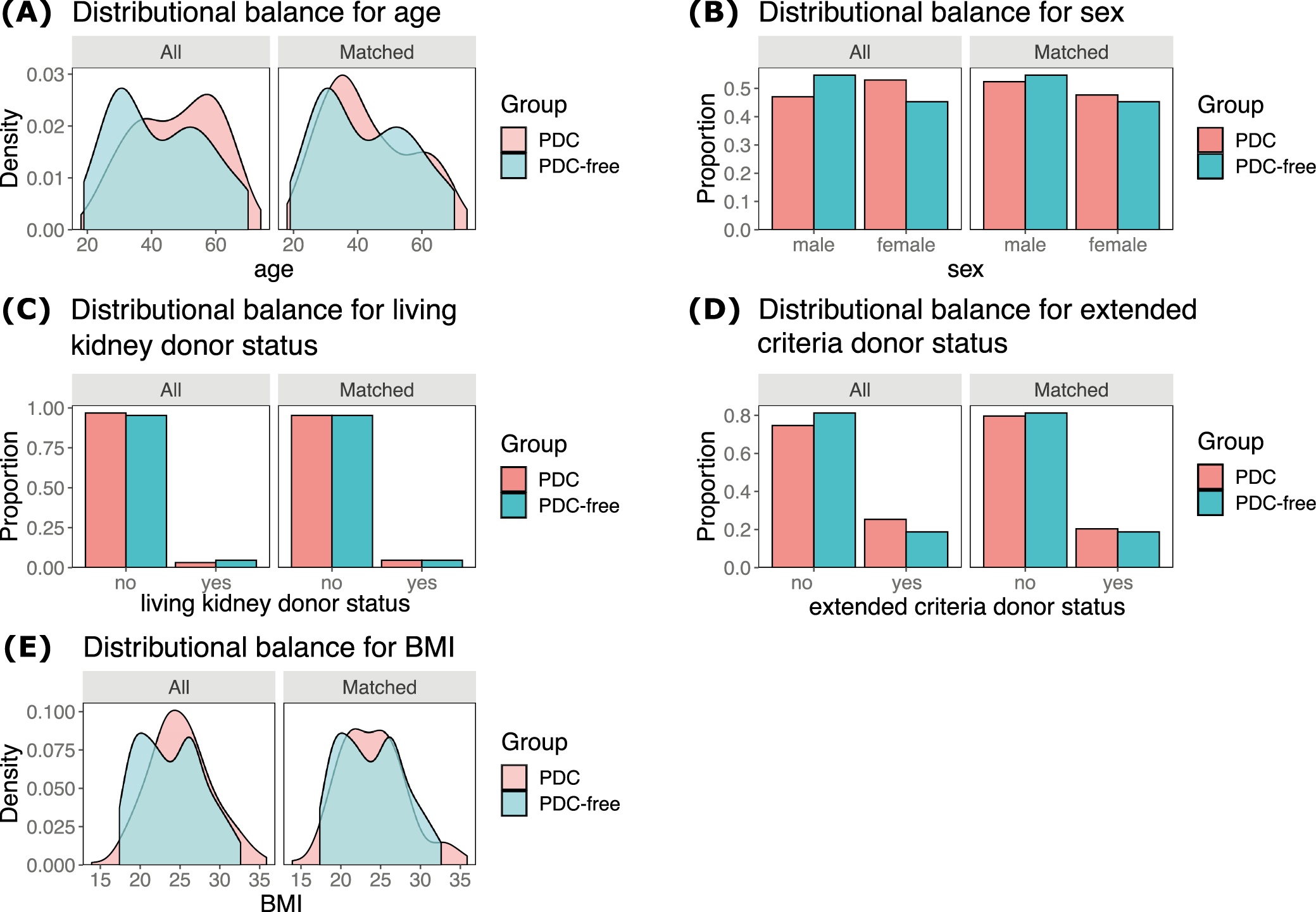 All patients were assigned to the group of recipients whose PDCs were removed at the time of renal transplantation (the PDC-free group) or after the procedure (the PDC group). Cardinality matching18 was used to match patients 1:2 by 5 covariates, i.e., kidney recipient’s age, sex, BMI, living, and extended criteria donor statuses. These factors were selected based on the discussion and consensus among the co-authors, following the evaluation of a web of causation and literature search (to identify factors affecting both the peritoneal dialysis removal and the need for dialysis early after transplantation). Cardinality matching uses advanced programming techniques to find the largest matched sample balanced by prespecified covariates without relying on, and thus overcoming some limitations of, the propensity scores or coarsened covariate values.19, 20, 21 The matching was performed using the MatchIt package22 in R with the optimization performed by the HiGHs optimization solver.23 An imbalance between the groups was considered when absolute mean differences were greater than 0.1.
