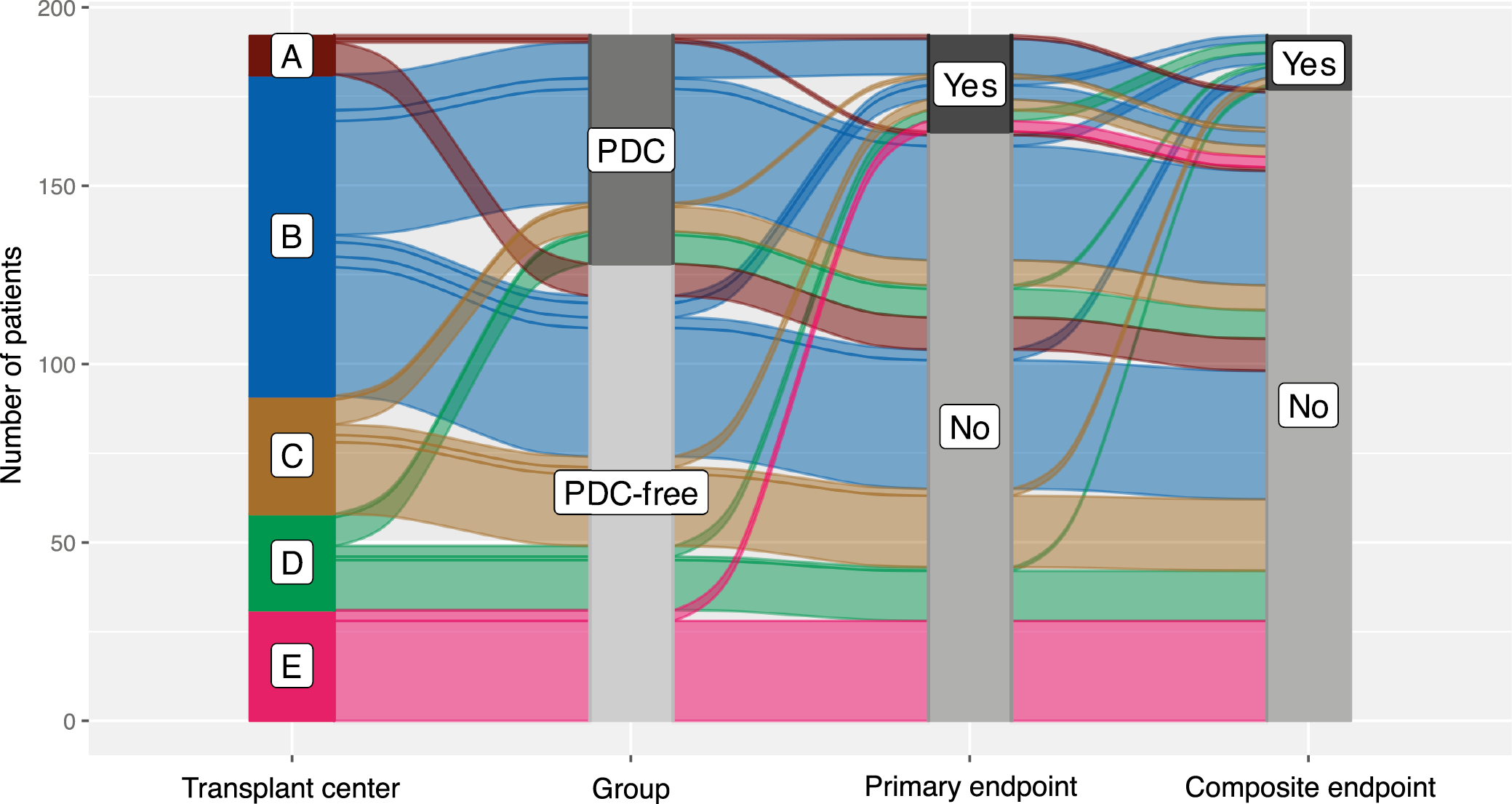 We collected data from 324 patients from 5 transplant centers. After excluding those with missing data for the matching or grouping variables, 324 were considered eligible for inclusion. In the final analysis, 64 patients from the PDC-free group were matched 1:2 with 128 patients assigned to the PDC group (a total sample size of 192). The flow of patients in the study is summarized in Figure 1.