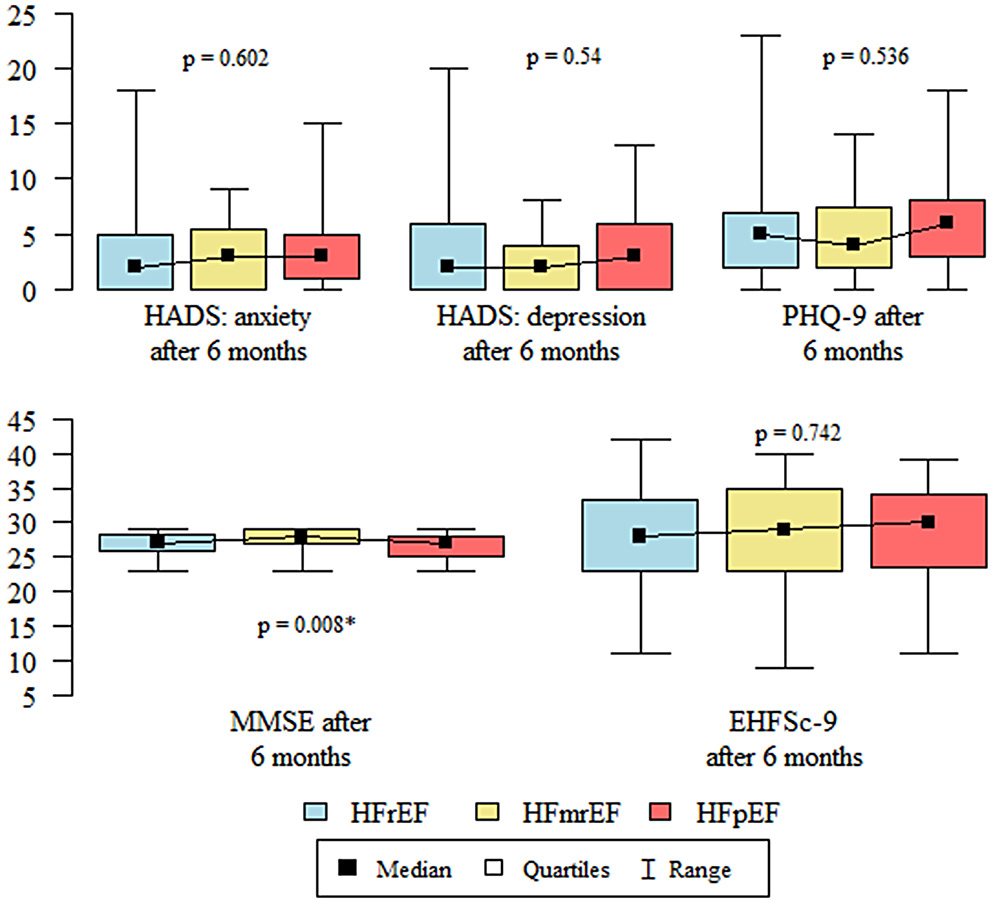 Results. Cognitive impairment indicated with the MMSE was less severe in patients with mildly-reduced HF (HFmrEF) compared to preserved EF (HFpEF) (MMSE median scores: 28 [interquartile range (IQR): 27–29] vs 27 [IQR: 25–28]; p = 0.008). The HADS showed that severity of depression worsened over 6 months, particularly in the HFpEF group (median scores increased from 1 [IQR: 0–4] to 3 [IQR: 0–6]; p = 0.006). Self-care ability declined in all groups as indicated in the increased EHFSc-9 (poorer self-care) median scores, which changed from 28 [IQR: 21–33] at baseline to 29 [IQR: 23–34] at 6 months (p = 0.035). Additionally, NT-proBNP parameters were higher in the HFrEF group (3437.7 pg/mL [IQR: 1336.33–6226.43) compared to both HFmrEF and HFpEF (2171.2 pg/mL [IQR: 806.65–4033.15] and 977.1 pg/mL [IQR: 576.9–3708.95, respectively, p = 0.001).