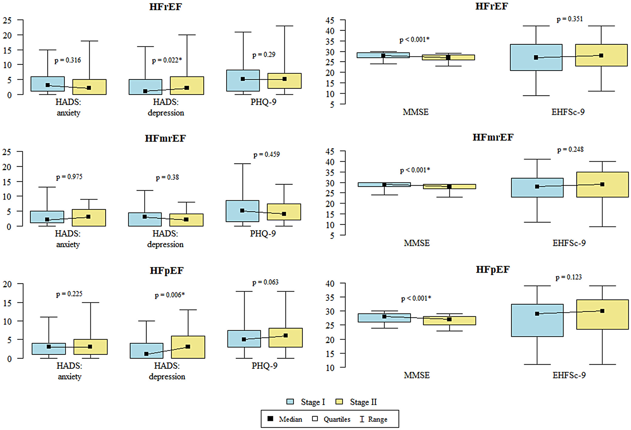 Statistical analysis for patients with HFrEF and HFpEF showed that the level of depression according to HADS was significantly higher in stage II than in stage I. Statistical analysis for patients with HfmrEF, HfrEF and HFpEF CI according to the MMSE was significantly less severe in stage I than in stage II (Table 6, Figure 3).