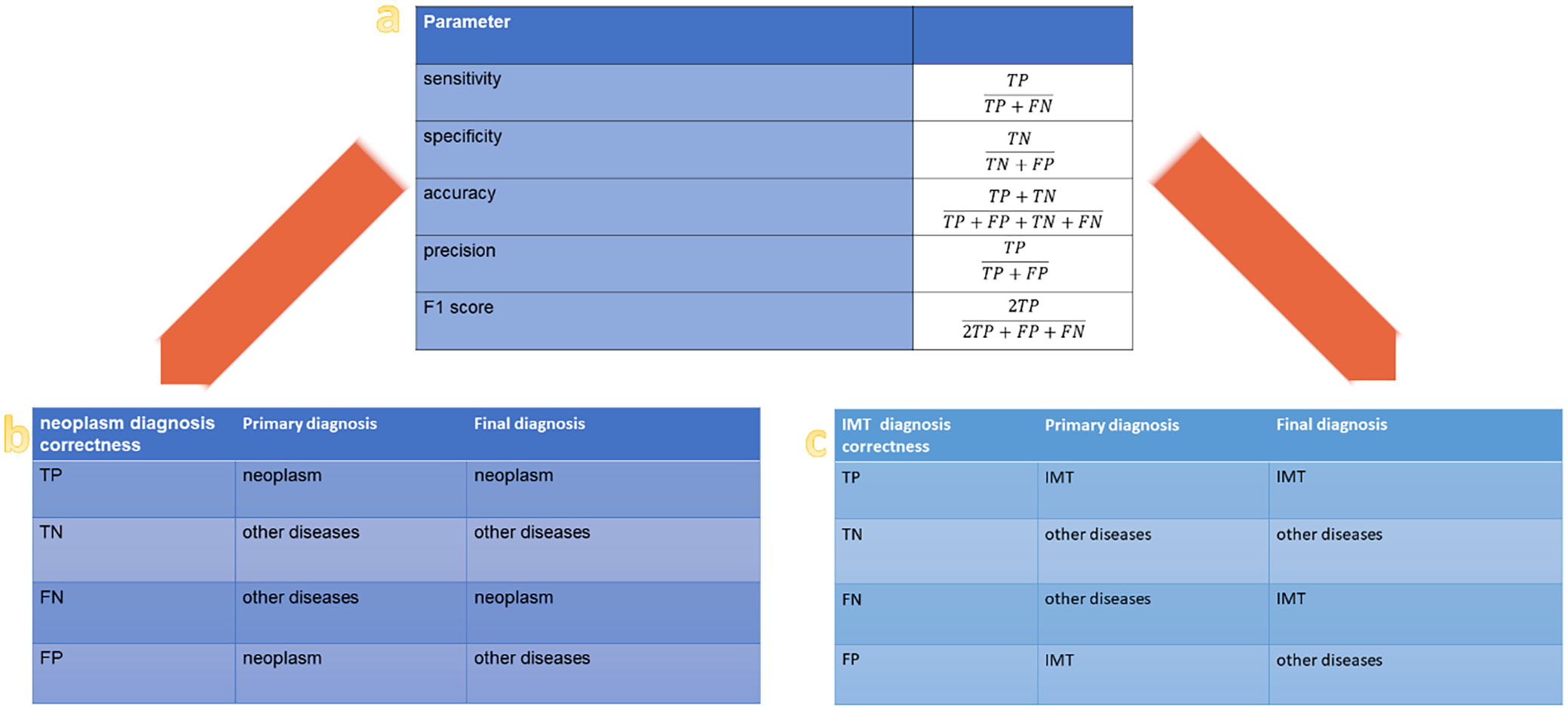 The statistical parameter formulas and definitions used for diagnostic verification are outlined in Figure 3. Dichotomous division was used at each stage of the analysis, e.g., neoplasms compared to other diseases, IMTs compared to other ISCLs, recurrent compared to non-recurrent cases, and patients who died compared to those who survived. To assess the impact of the dichotomous classification, odds ratios (ORs) and 95% confidence intervals (95% CIs) for the 2 proportions were calculated using the method described by Tenny et al.25 These statistical parameters were selected because they effectively quantify the strength of association between the 2 groups (with and without events) in retrospective studies.25 Probability values (p-values) were calculated using the MedCalc online calculator (https://www.medcalc.org).