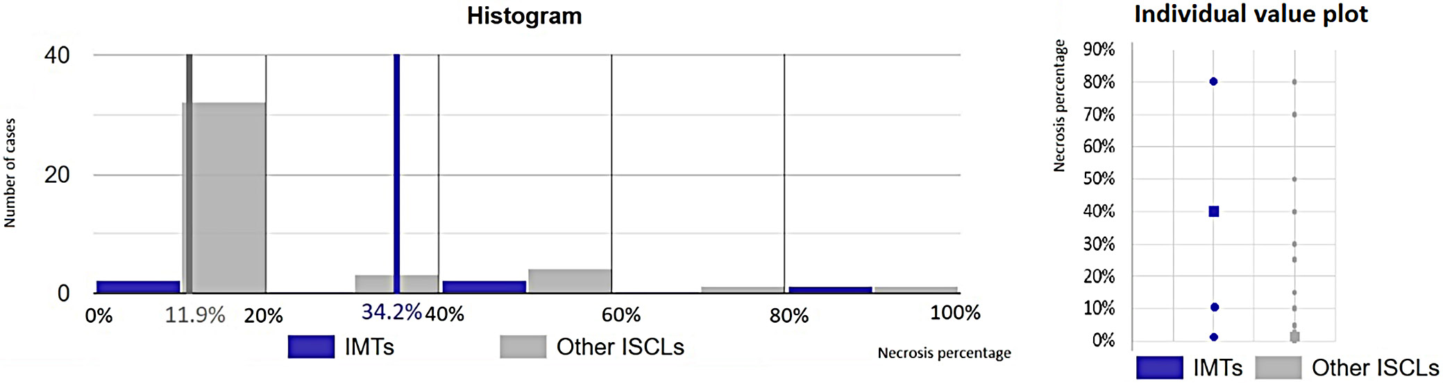 Necrosis, calcifications and extravasated erythrocytes are rare in IMTs.59 Höhne et al. noted the presence of necrosis both in IMTs and IPTs but did not define a differentiating percentage.60 In this study, IMTs showed a significantly higher necrosis percentage than other ISCLs, as confirmed using the Mann–Whitney U test. Furthermore, a higher necrosis percentage was statistically associated with increased mortality.