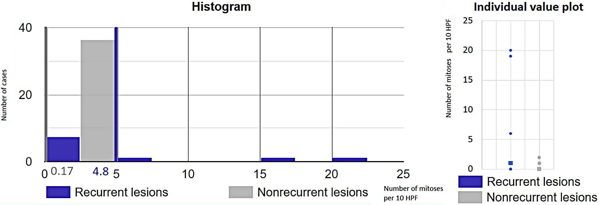 An increased mitotic rate (>5 mitoses per 10 high-power fields) was observed in 3 recurrent cases: anaplastic meningioma (case 9), sarcomatoid urothelial carcinoma (case 13) and spindle cell squamous cell carcinoma (case 41). Recurrence occurred in all 3 cases within 6 months (Table 4). Statistical analysis using the Mann–Whitney U test (U = 269, p = 0.002) revealed a significant difference in mitotic index values between recurrent lesions (mean: 4.8/10 HPF) and non-recurrent lesions (mean: 0.17/10 HPF), confirming statistical significance at the 5% level (Figure 7).
