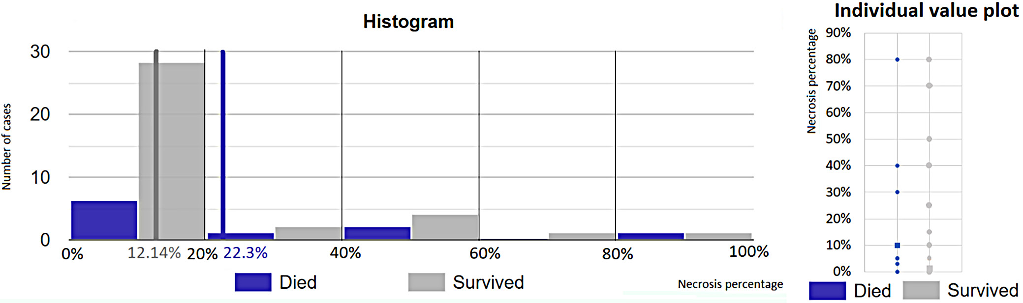 Although no statistically significant relationship was found between necrosis and recurrence, the necrosis percentage differed significantly between patients who died during the study and patients who survived. It was assessed using the Mann–Whitney U test (U = 253, p = 0.043), which showed a statistically significant difference between 1st (arithmetic mean: 22.3%) and 2nd group (arithmetic mean: 12.14%) at the 95% CI (Figure 8).