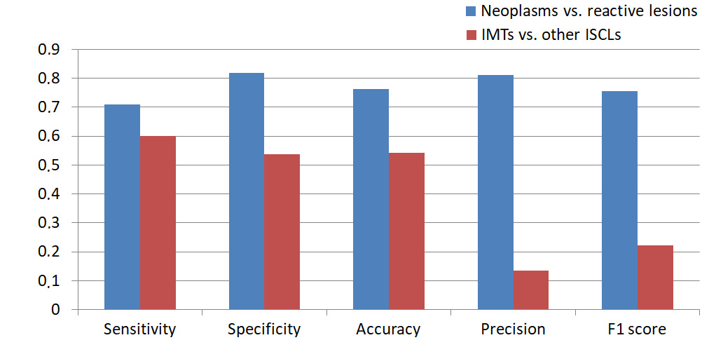 In this study, primary histopathological diagnoses were compared to final diagnoses, which were based on clinical and paraclinical data. The results indicate that histopathological diagnostics are highly satisfactory for distinguishing between neoplastic and reactive lesions. However, primary recognition of IMT was inconsistent with the final diagnosis. The low values of precision, F1 score and sensitivity highlight the risk of diagnostic inaccuracies, even within academic medical centers. This aligns with prior publications highlighting the risk of misdiagnosis in histopathological evaluation of ISCLs.10, 36, 37, 38, 39, 40, 41 Our findings underline the prevalence of this problem.
