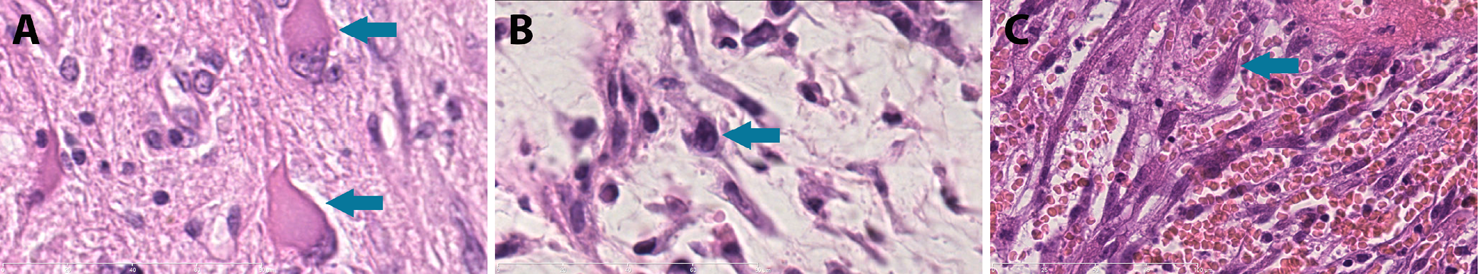 Ganglion-like cells were identified in specimens from 3 patients with recurrent neoplastic tumors (Table 4), including anaplastic meningioma of the right occipital region (case 9), desmoid fibromatosis of the right axillary region (case 12) and sarcomatoid urothelial carcinoma of the urinary bladder (case 13) (Figure 6).