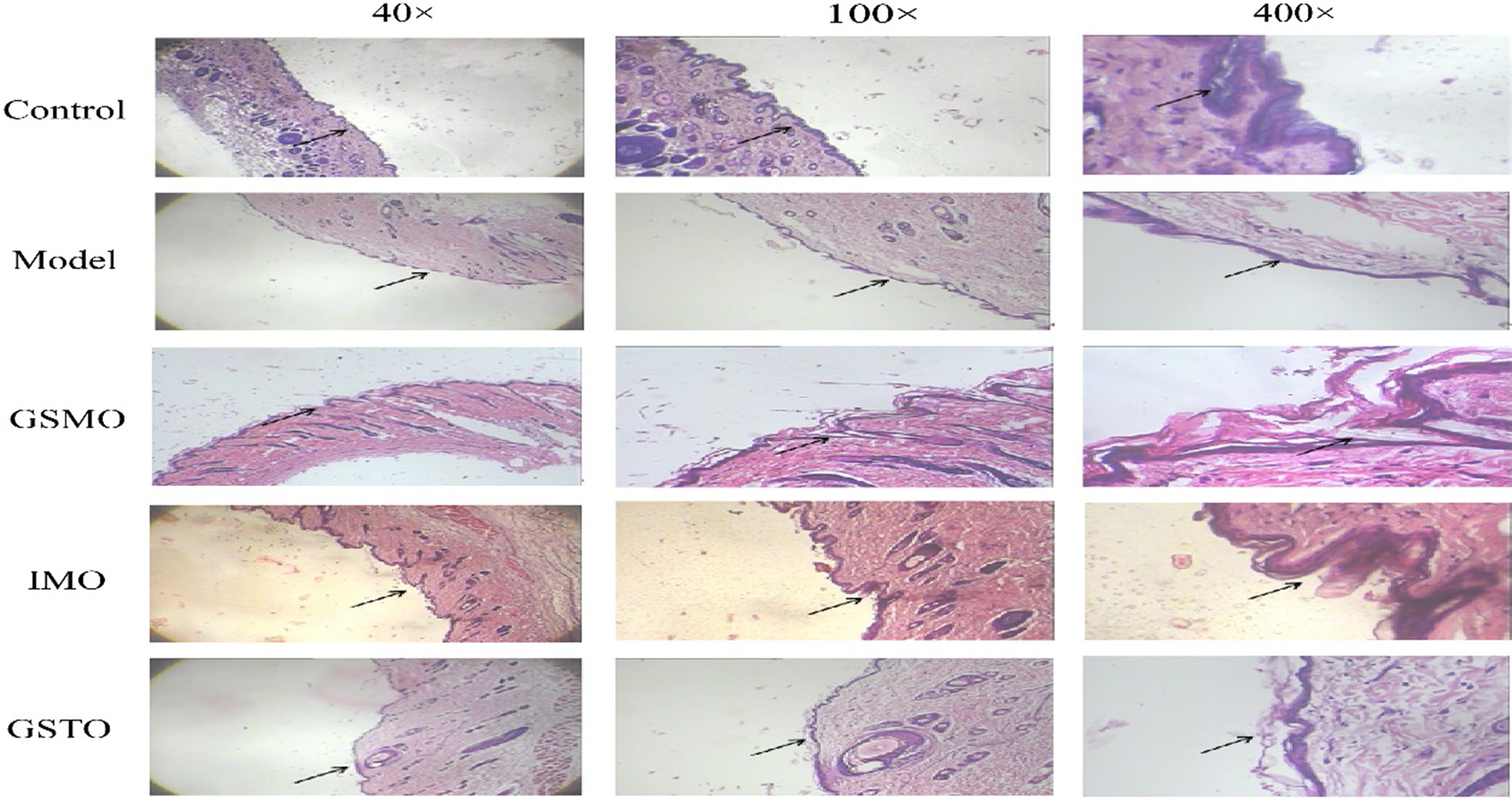 The results of H&E staining showed that in the model group, the stratum corneum exhibited a strip-like and uniform distribution, with tightly arranged cells involved in the formation of the stratum corneum. In comparison to the model group, both the GSTO group and GSMO group showed a loosely arranged stratum corneum with increased intercellular spaces, indicating that the physical stimulation of gua sha enlarges the interstitial spaces in the skin tissue of the applied area (Figure 1).