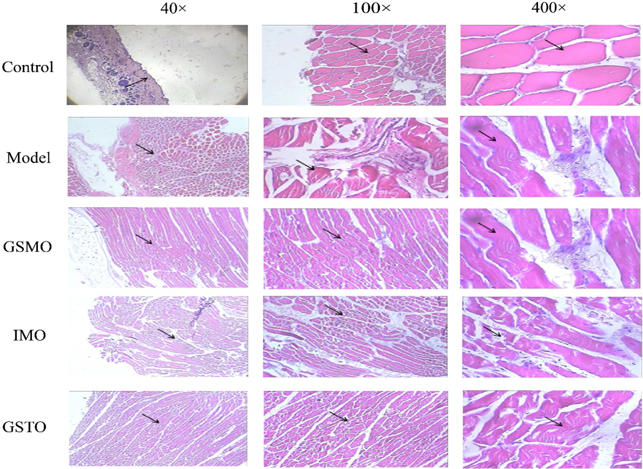 Hematoxylin and eosin staining also revealed that in the model group, the local muscle tissues in the injured area exhibited irregular cell arrangement, muscle fiber degeneration, necrosis, and dead muscle fibers, along with the proliferation of connective tissue. In comparison to the model, IMO and GSTO groups, the pathological changes in muscle tissues were less pronounced in the GSMO group, suggesting that GSMO significantly improves the degree of soft tissue damage (Figure 2).