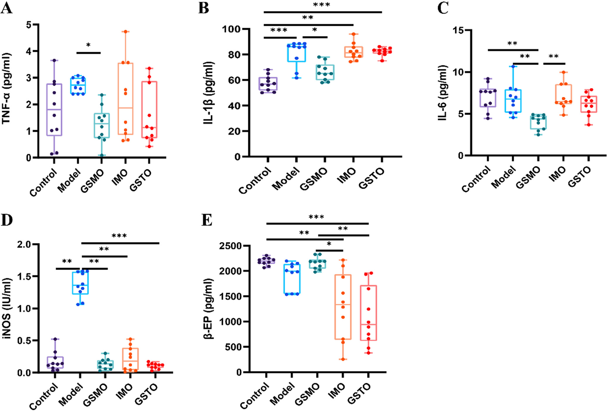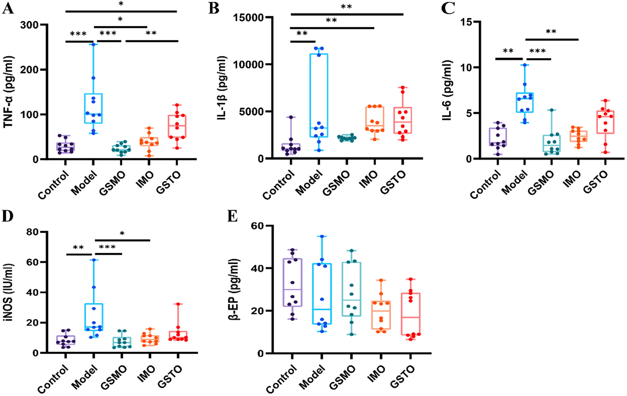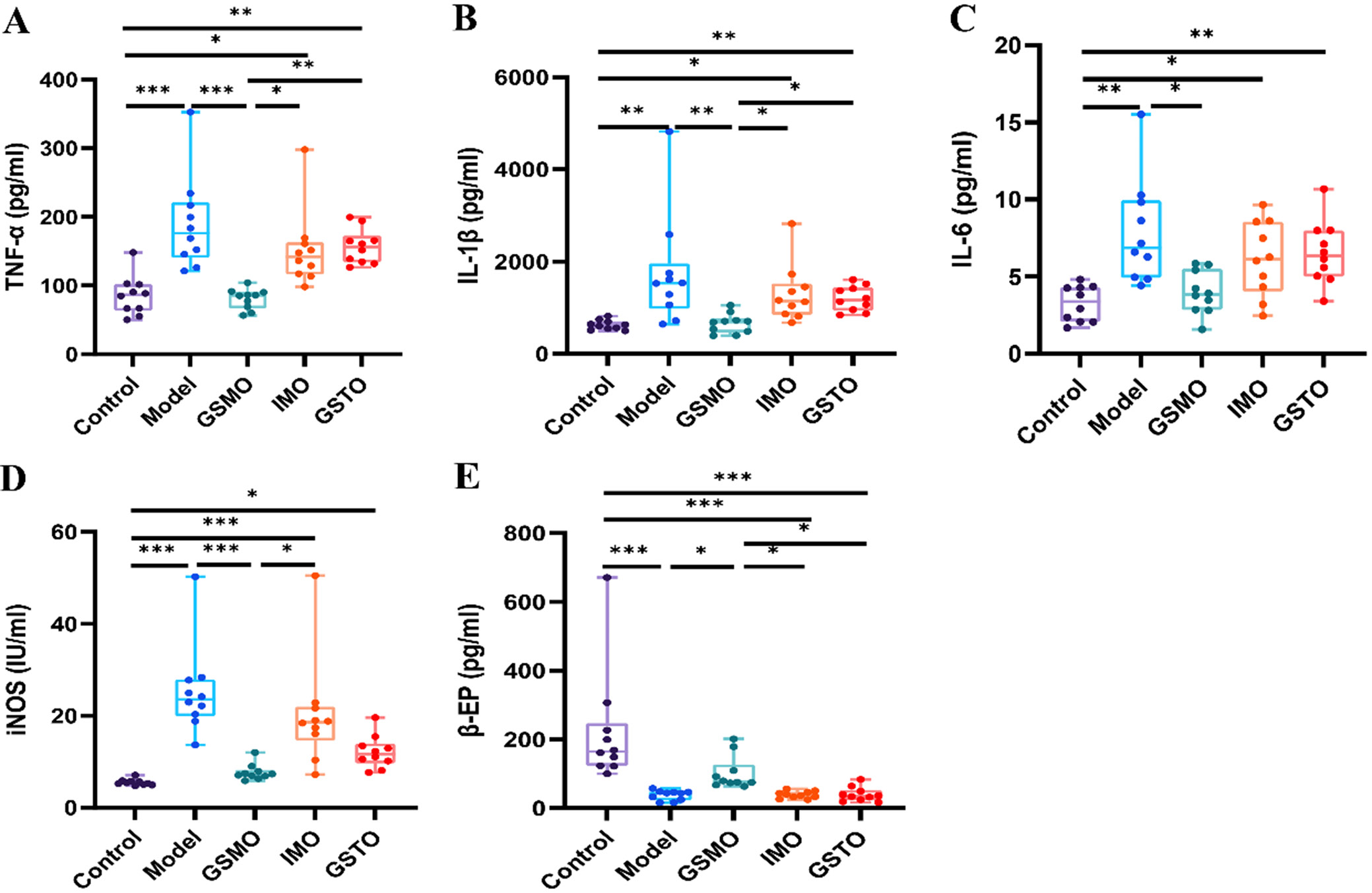 After treatment, in comparison to the model group, the GSMO group demonstrated a significant decrease in serum levels of TNF-α (post hoc Dunn’s test: p = 0.019), IL-1β (post hoc Dunn’s test: p = 0.015), IL-6 (post hoc Dunn’s test: p = 0.004), and iNOS (post hoc Dunn’s test: p = 0.001). Additionally, both the IMO and GSTO groups exhibited a significant reduction in serum levels of iNOS (post hoc Dunn’s test: p = 0.003, p < 0.001, respectively) when compared to the model group. When compared with the GSTO group, the GSMO group demonstrated an increased level of β-EP (post hoc Dunn’s test: p = 0.001). However, no significant differences were observed in these cytokine levels between the GSTO and IMO groups. Notably, the GSMO group displayed remarkable differences in IL-6 (post hoc Dunn’s test: p = 0.002) and β-EP (post hoc Dunn’s test: p = 0.015) levels compared to the IMO group. Furthermore, compared to the control group, a notable reduction in the levels of IL-6 (post hoc Dunn’s test: p = 0.001) was observed in the serum of the GSMO group, while no significant differences were observed in TNF-α, IL-1β, iNOS, and β-EP levels in the GSMO group when compared to the control group. Similarly, no significant differences in the levels of TNF-α, IL-6 and iNOS were observed in the serum of the IMO and GSTO groups compared to the control group (Table 3, Figure 5A–E).
