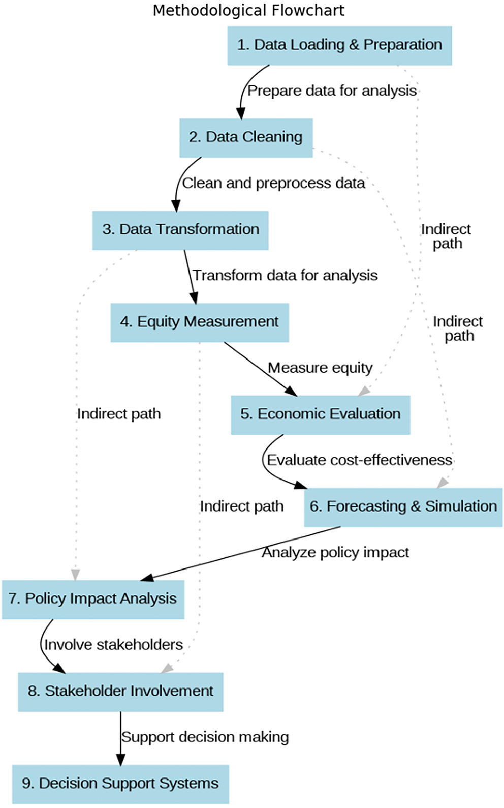 Multi-criteria decision analysis (MCDA) is a decision-support tool that helps evaluate multiple policy alternatives by considering several criteria. This study used MCDA to compare different healthcare policies based on factors such as equity, cost and efficiency. The analysis was conducted using Python 3.10 on Google Colab (Google LLC, Mountain View, USA), enabling a systematic ranking of policy options. The criteria for evaluating policies were identified based on their relevance to healthcare sustainability. Weights were assigned to each criterion through expert consultation, with equity (40%), cost (30%) and efficiency (30%) being prioritized. Each policy alternative was scored against these criteria, and the weighted sum model was used to compute the overall scores. The MCDA results showed that Policy C outperformed the others, with the highest score of 0.90, indicating it was the most effective in balancing cost, equity and efficiency. This structured decision-making process ensured that the chosen policy would maximize healthcare benefits while maintaining financial sustainability. The MCDA provided a clear framework for making well-informed, transparent policy decisions in the context of healthcare. Figure 1 shows the methodology adopted for this study. Initially, the data were loaded and prepared for analysis, cleaned, and preprocessed using various methods to ensure that missing data points did not adversely affect the applicability and accuracy of this research. Then, the data were transformed into a form that could be fed to the models involved in this study. The parsed data was analyzed to determine the extent of the equitability of healthcare distribution. The chosen method for this purpose was the Theil index and multilevel modeling. The economic sustainability of the various healthcare activities was analyzed by comparing their cost differentials against the differences in their effectiveness using the incremental cost-effectiveness ratio (ICER). Autoregressive integrated moving average (ARIMA) was then used to forecast future healthcare expenditures and needs. In contrast, systems dynamics modeling was used to evaluate the impact of policy changes on healthcare sustainability. Policy impact was analyzed deterministically and stochastically, while game theory was used to identify optimal decisions. The Delphi technique involved stakeholders, while MCDA was used to determine the ideal choices in ensuring healthcare sustainability. These details were further elaborated in the sections Study Design, Data Collection, Analytical Techniques, Stakeholder Engagement, and Policy Evaluation. This research used a cross-sectional design to build an equity-based financial model supporting sustainable healthcare delivery across Arab countries. It used national health accounts, demographic surveys and data on the health outcomes of multiple countries as components. Analytical tools employed when measuring equity and assessing the sustainability of costs included multilevel analysis and spatial analysis, among others. Cost considerations and system dynamics projections identified upcoming healthcare costs and resources required in the future. Delphi techniques and focus groups were prerequisites for assured stakeholder participation. The study sought to offer country-specific policy solutions to improve healthcare accessibility and financial stability within the Arab world. The study was conducted among healthcare systems in the Arab region and included primarily quantitative data. The target population would be national healthcare systems involving data from healthcare institutions, policymakers and patients. The stratified random sampling model included participants from different socioeconomic groups and diverse health facilities, including urban and rural settings. Individual data participants were divided into various strata based on their socioeconomic standings, after which participants were randomly selected until the requisite quotas were met. Data sources included National Health Accounts, demographic surveys, sentinel hospital records, and public health databases. The data were analyzed using multilevel, spatial and economic methods and other quantitative techniques, including multilevel modeling, spatial analysis and economic evaluations. This approach enabled a more integrated and comprehensive assessment of healthcare equity and sustainability in the Arab region.
