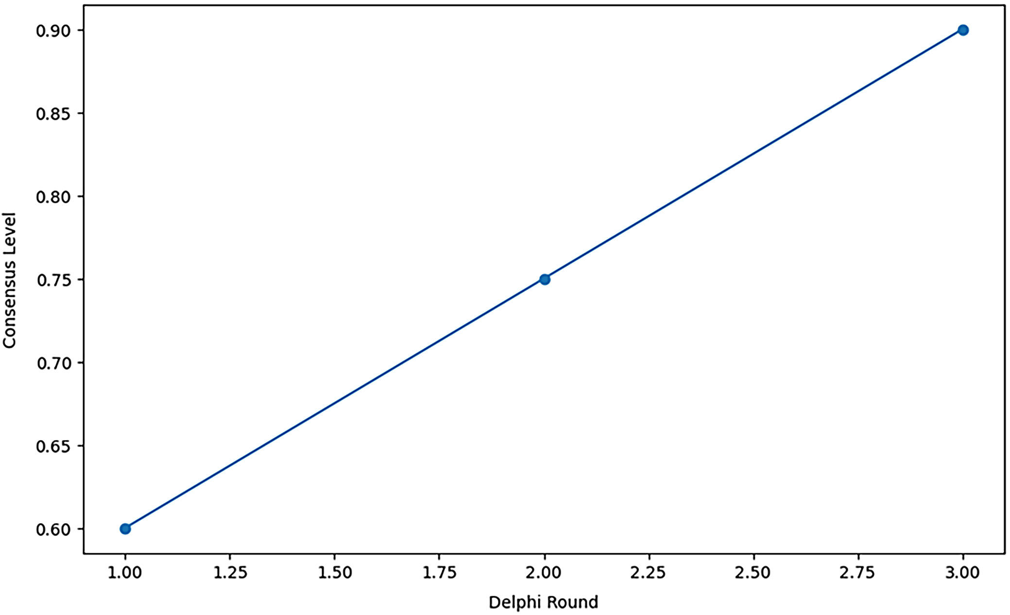 Figure 10 shows the “Delphi technique consensus over rounds,” which shows the consensus trend achieved by the expert panel across 3 survey rounds. The Delphi technique is an interactive method of reaching a consensus, which involves completing several sequential questionnaires. The figure thus depicts an upward trend, suggesting that the consensus level locally gets higher in the 3 rounds. It starts from a consensus level of 0.60 in the 1st round, increases to about 0.75 in the 2nd round and approximates to 0.90 in the 3rd round. This gradual trend demonstrates that the cyclical feedback mechanism inherent in the Delphi method strengthens and synchronizes offenders’ perspectives, which causes a high consensus over time.
