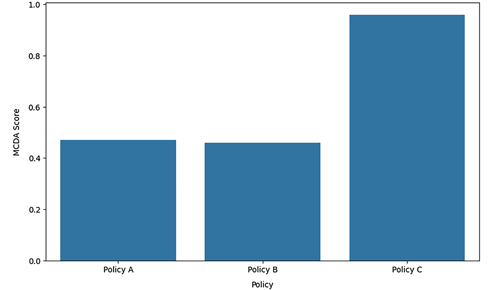 Figure 11 illustrates the MCDA scores for 3 different policies: A, B and C. Indeed, the chart “MCDA scores for different policies” provides an MCDA comparison of various policies about several criteria, which could be assumed to pertain to an equity-based financial framework for the sustainable healthcare system. Policy C is the best-performing policy according to the score closest to 1 and significantly outperforms Policies A and B. This implies that Policy C is the most preferred policy based on the adopted MCDA sets of criteria. Policies A and B have similar and lower values close to 0.5, suggesting a similar but lower level of performance. The importance of this figure is in ensuring that consumers can make an impartial comparison of the policies. Stakeholders can, therefore, quickly determine whether one policy is better than the other in achieving the goal of equity and a more sustainable healthcare system framework. The conclusion that can be made based on the figure is that Policy C is the best option as it holds the greatest likelihood of realizing the set objectives.