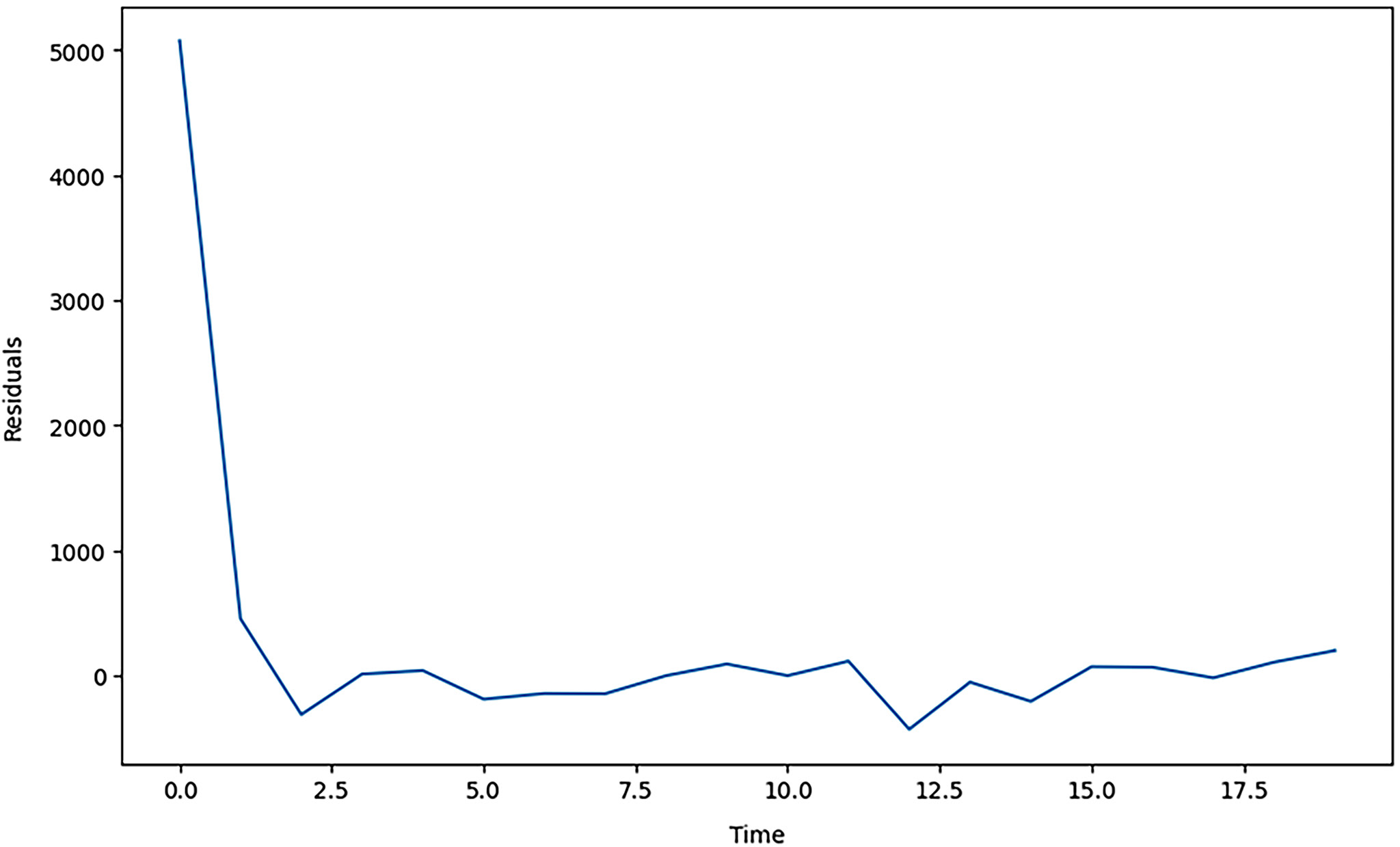 Figure 12 is the “Residuals of autoregressive integrated moving average (ARIMA) model.” The plotting factors show the residuals as a time series, where the residuals are calculated as the difference between the observed and the fitted values. First, the residuals are observed to be relatively large, with a maximum of over 5,000; however, they reduce sharply and oscillate around 0 periodically. This pattern suggests that after a certain period, the data-generating process is well captured by the ARIMA model. The high initial residuals imply that the model takes some time before stabilizing to fit the dataset. Over time, the residuals reach a pattern of randomness, thus suggesting that the model’s forecasts are improving and becoming more coherent. In essence, this figure is essential in verifying the reliability of the selected ARIMA model. The fluctuation of residuals around 0 indicates that the residual values are centered along the 0 line, suggesting that the model has accurately captured the data pattern and provides a good fit. The conclusion that can be derived from this analysis is that ARIMA is an effective forecasting model whose ability to predict accurately can be established from the residuals, which are low and constant after the initial adjustment period.