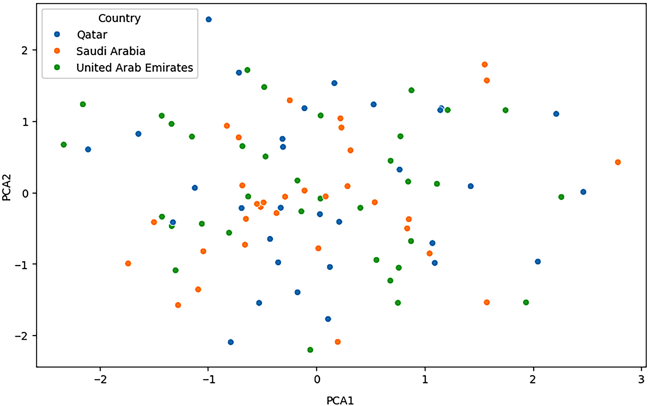 Figure 2 illustrates the application of PCA to healthcare data collected from Qatar, Saudi Arabia and the UAE. The PCA is an exploratory tool used in datasets to explore important features and patterns. It mainly aims to capture differences in the data through principal components. In this context, 1st principal component (PCA1) and 2nd principal component (PCA2) are the 2 leading principal components that explain the most significant number of variations in the healthcare data set. In the scatter plot, no distinct clustering of data points for the 3 countries was observed, suggesting that their healthcare data share similar characteristics concerning the identified principal components. Such overlapping means that perhaps there are minor variations in regional indicators, while the continuing fundamental healthcare statistics are similar across these countries. This suggests that the healthcare systems of the analyzed countries are structurally similar, facing comparable challenges and potentially benefiting from similar opportunities for advancement.
